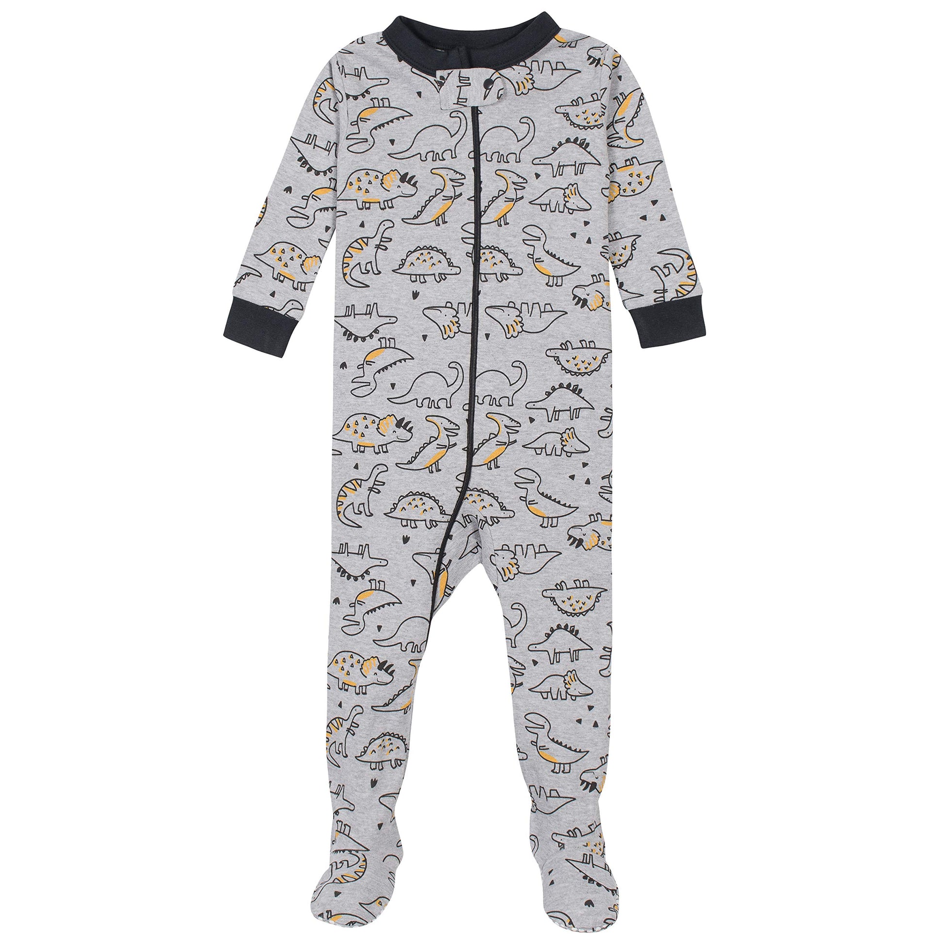 - Q: What patterns are available for the Gerber Baby Boys' Pajamas? A: This specific set features a grey dinosaur print with black stripes, adding a fun touch to bedtime.