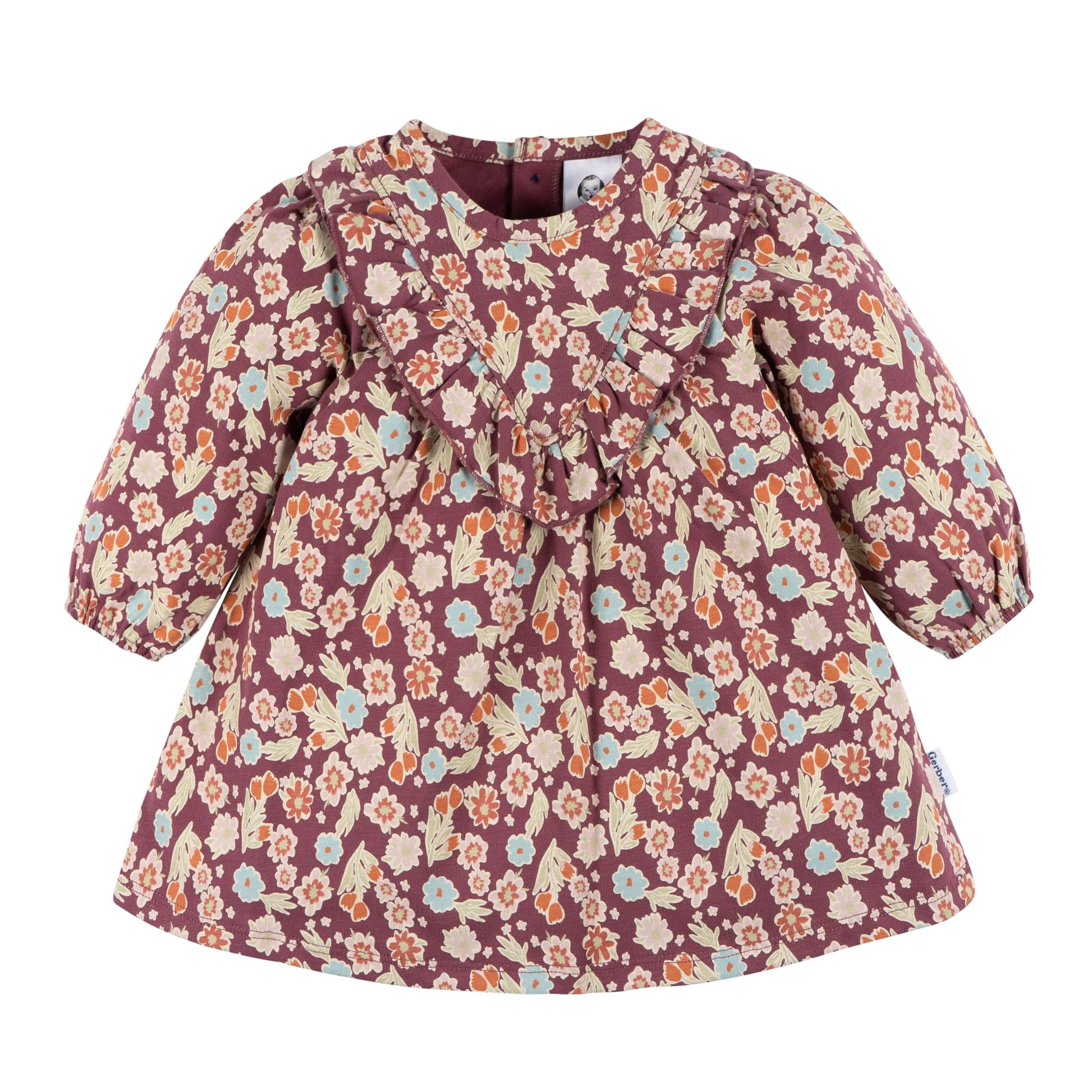 - Q: What is the design of the dress and leggings? A: The set includes a dark rose dress with a multi-color floral pattern paired with violet leggings, creating a stylish look for cooler weather.