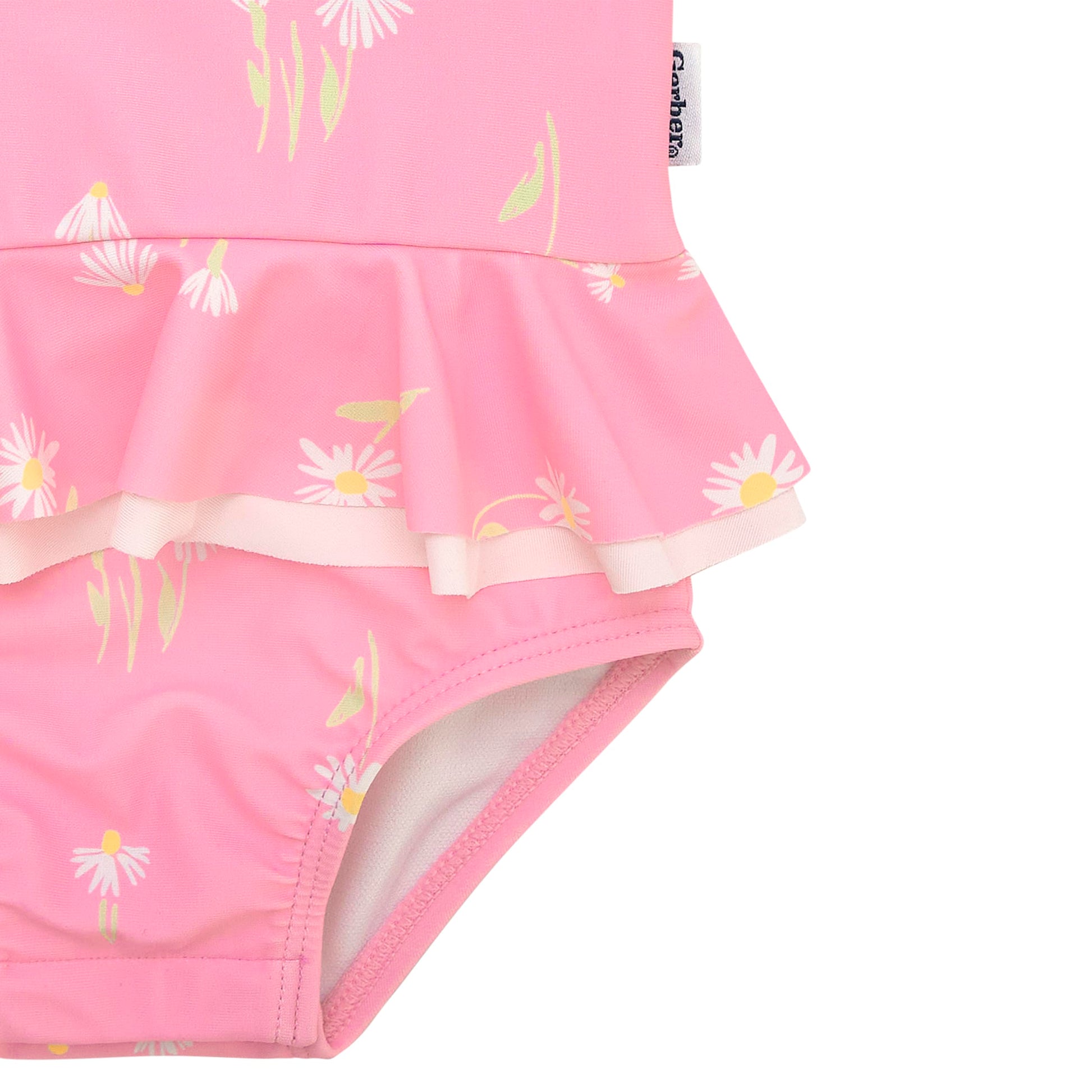 - Q: What are the key features of this swimsuit? A: Key features include comfort-stretch material, leg snaps for easy dressing and diaper changes, and a stylish waistline ruffle.