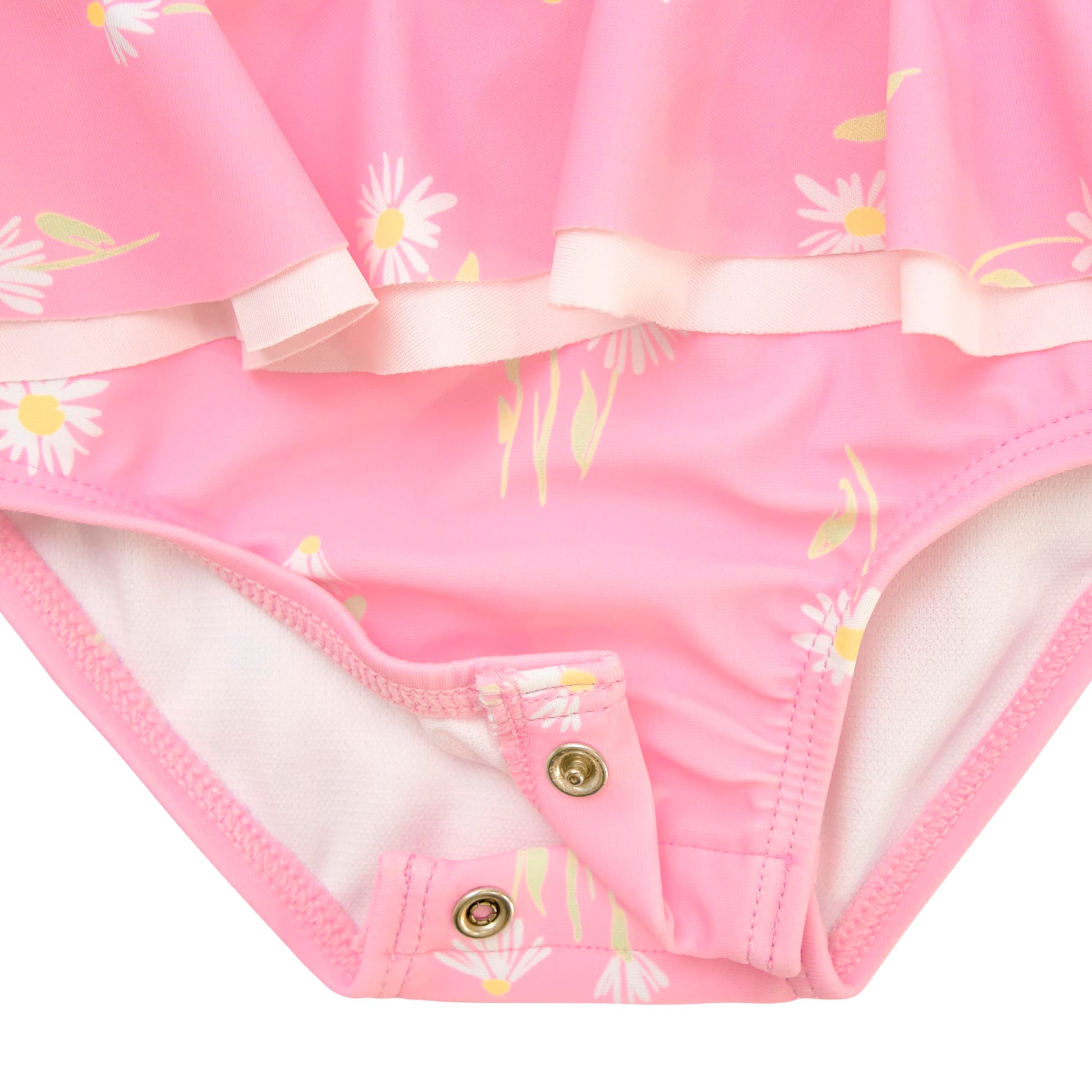 - Q: What colors does this swimsuit come in? A: This swimsuit is available in a pink color with white daisies.
