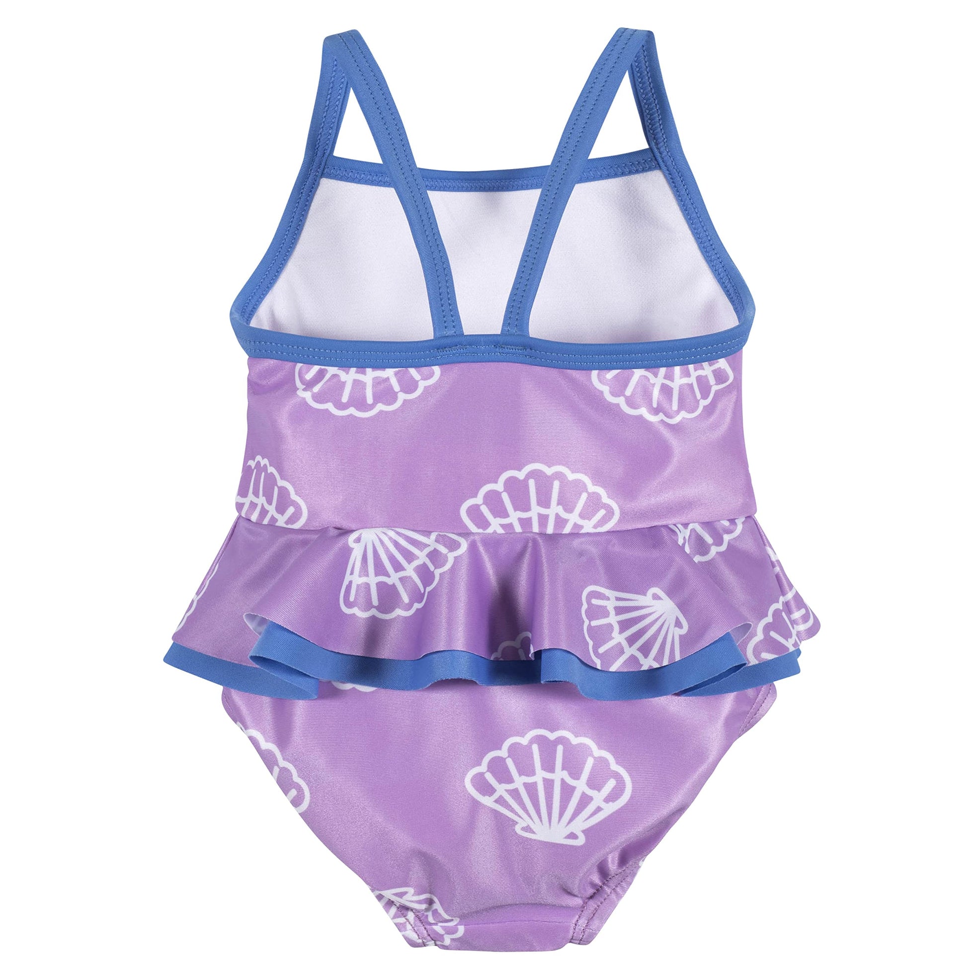 - Q: What color and print does this swimsuit come in? A: The swimsuit is purple with a shell print, adding a fun and vibrant look for your baby girl.