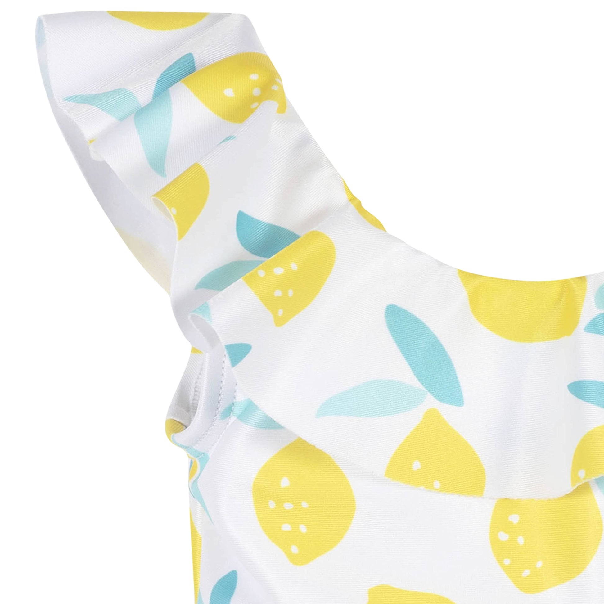 - Q: What color and design is this swimsuit? A: The swimsuit is white with an allover lemon print, making it a cheerful choice for your baby girl.