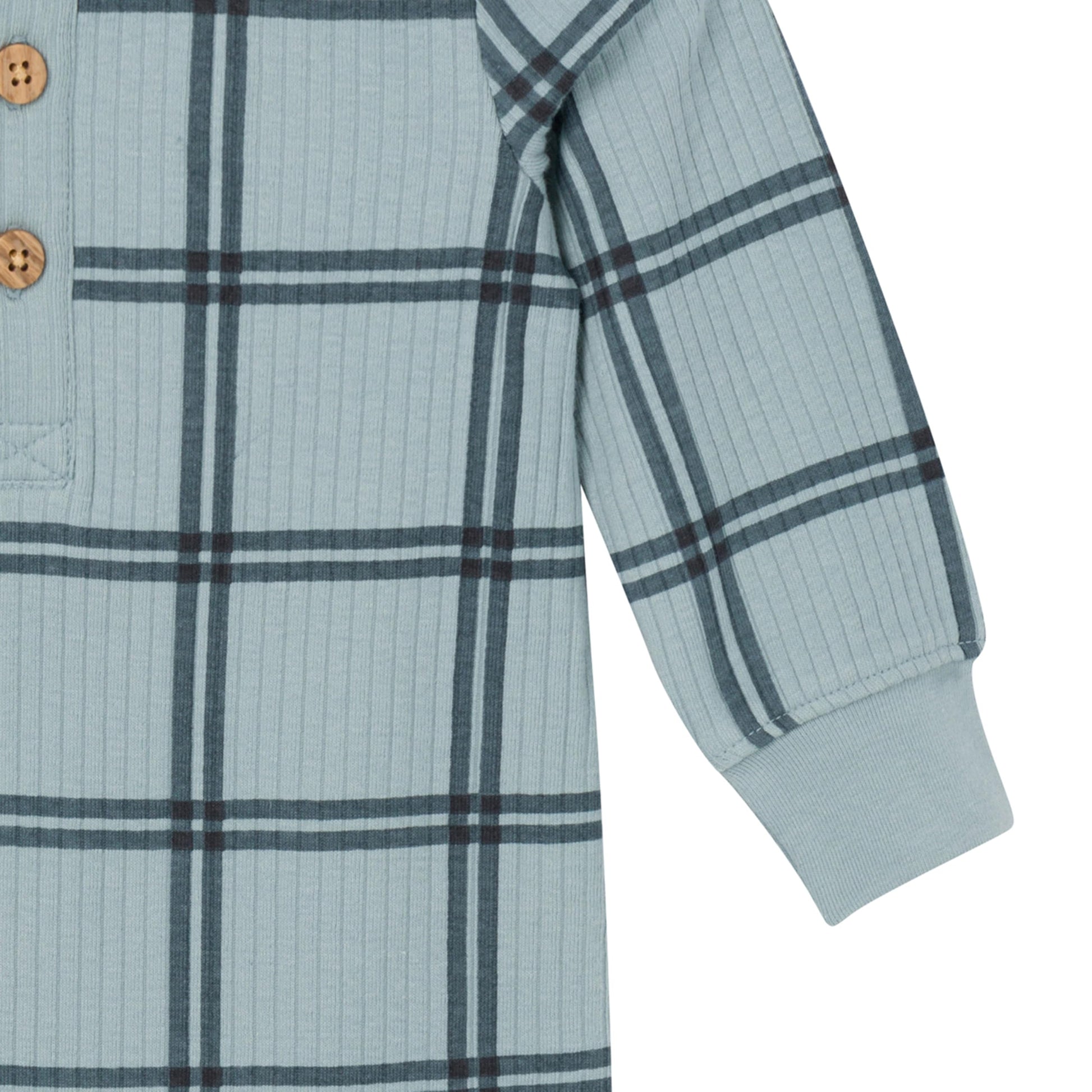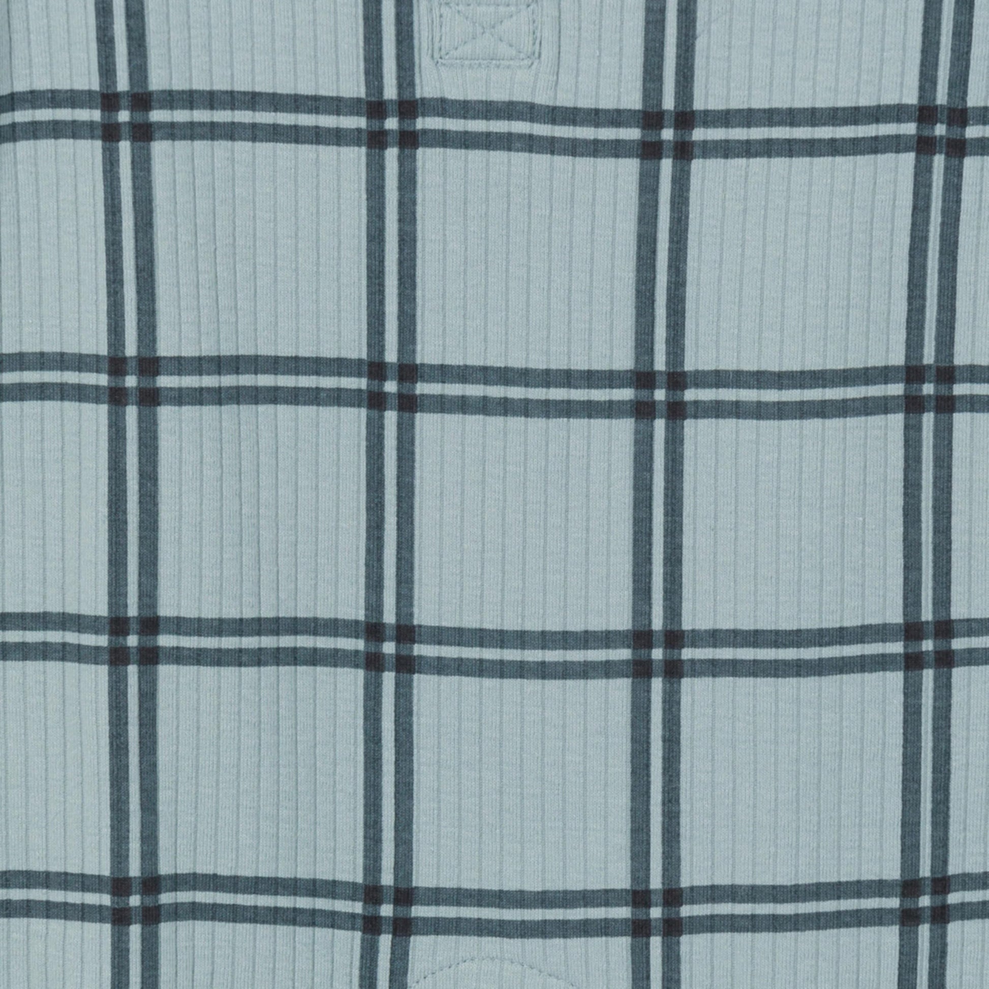 - Q: What kind of design does this romper have? A: The romper features a light blue plaid design with gray stripes.