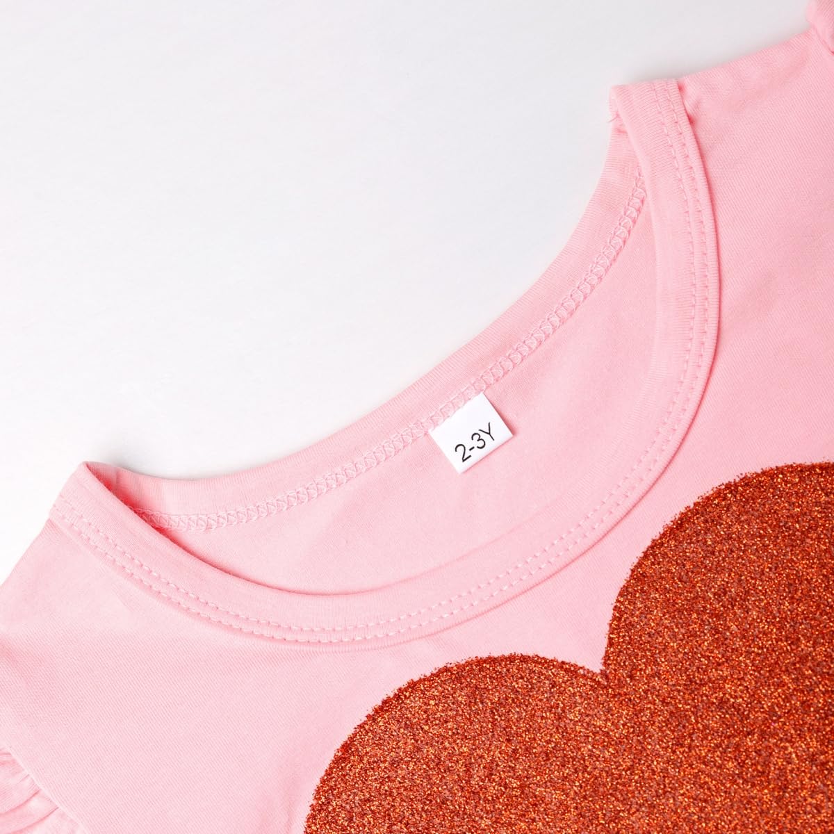 - Q: Does the dress have any special design features? A: Yes, the dress features a glittering heart print, a round neckline, and flutter sleeves, making it a stylish choice for your little princess.