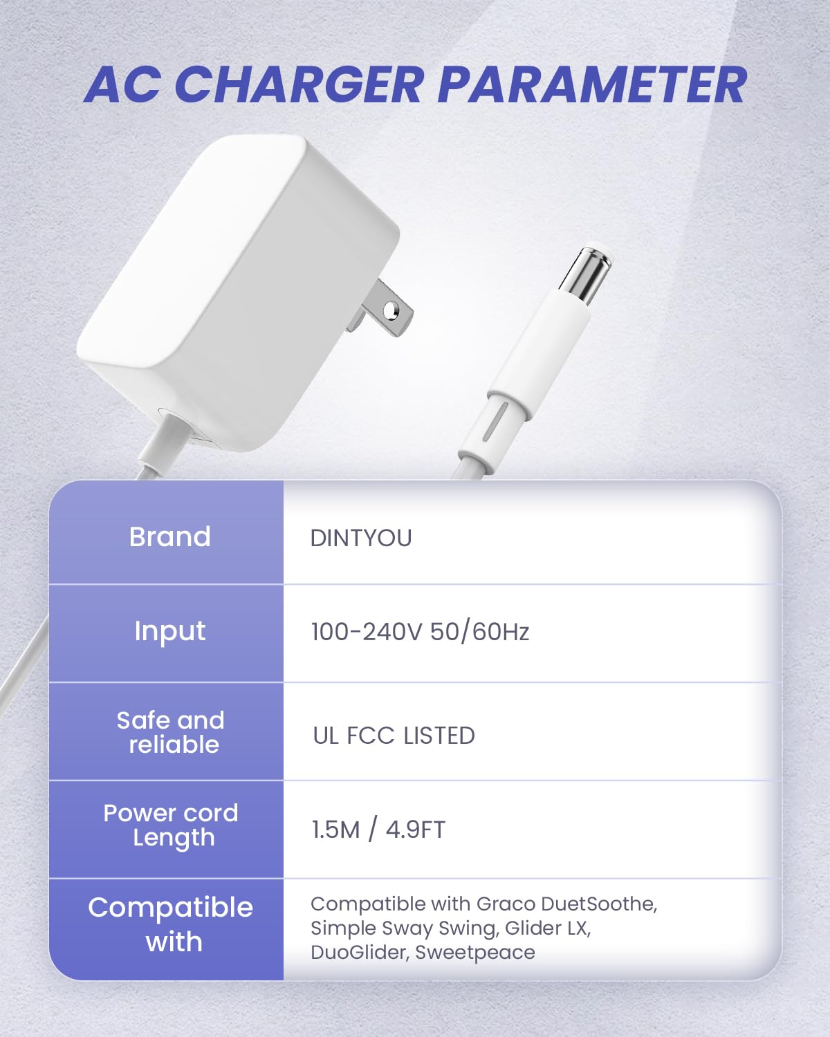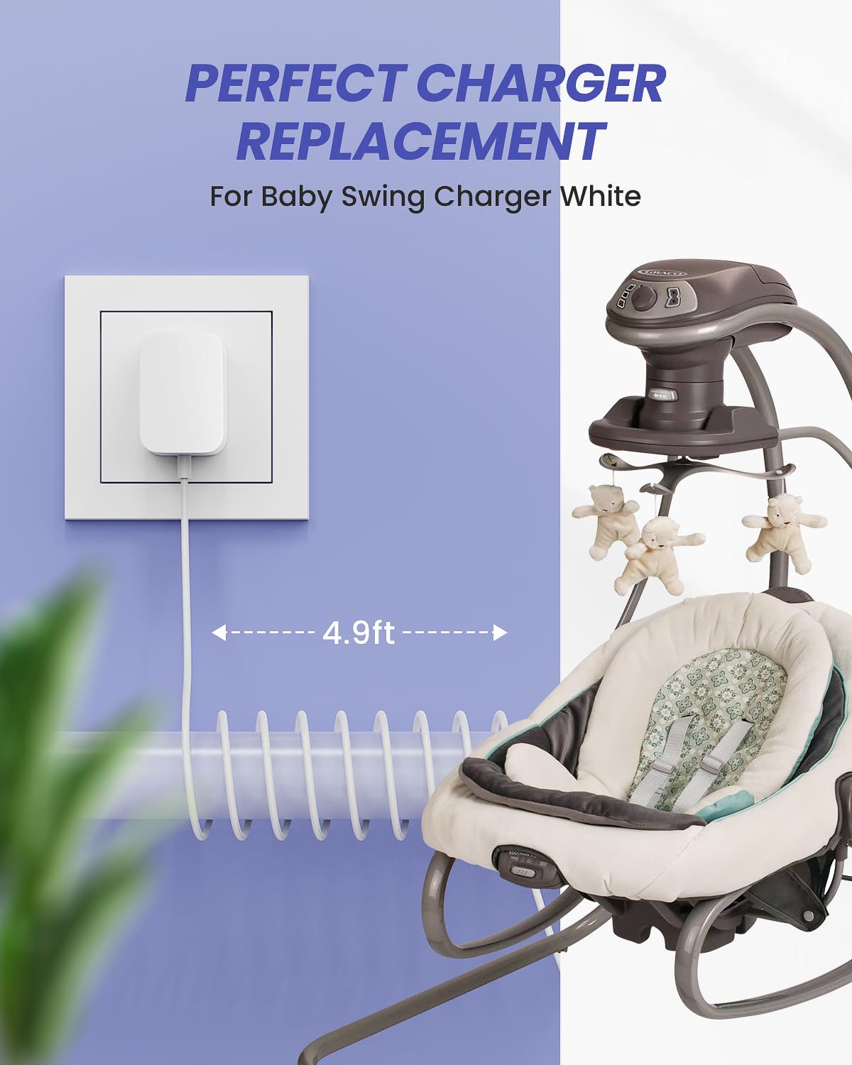 - Q: What type of plug does this charger use? A: The charger uses a DC round barrel plug connector for compatibility with the specified Graco baby swing models.
