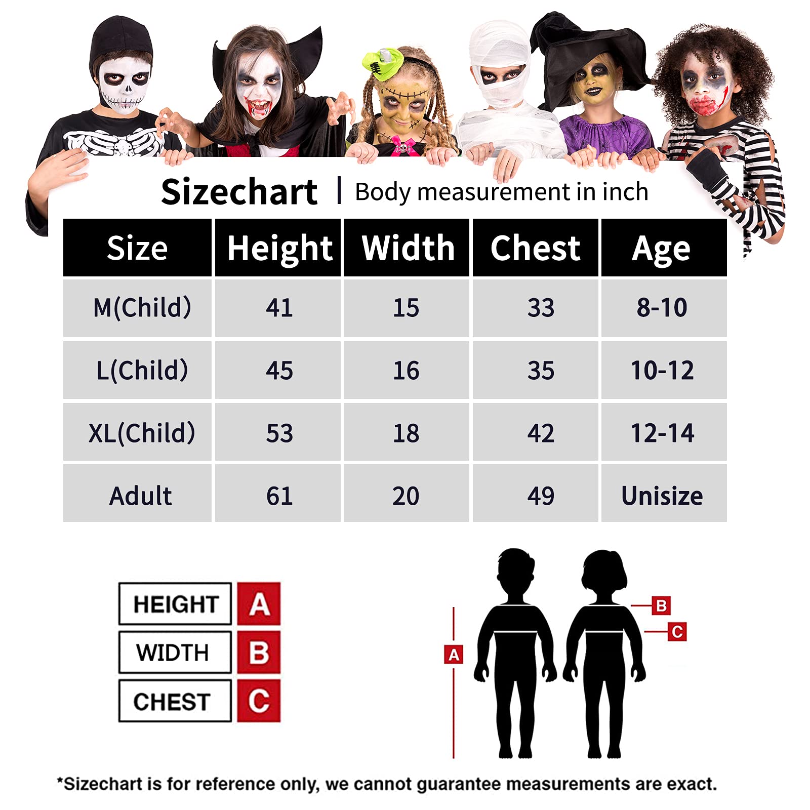 - Q: What sizes are available for the Grim Reaper costume? A: The Grim Reaper costume is available in Medium (for ages 8-10), Large (for ages 10-12), and X-Large (for ages 12-14). Please refer to the size chart for specific measurements.