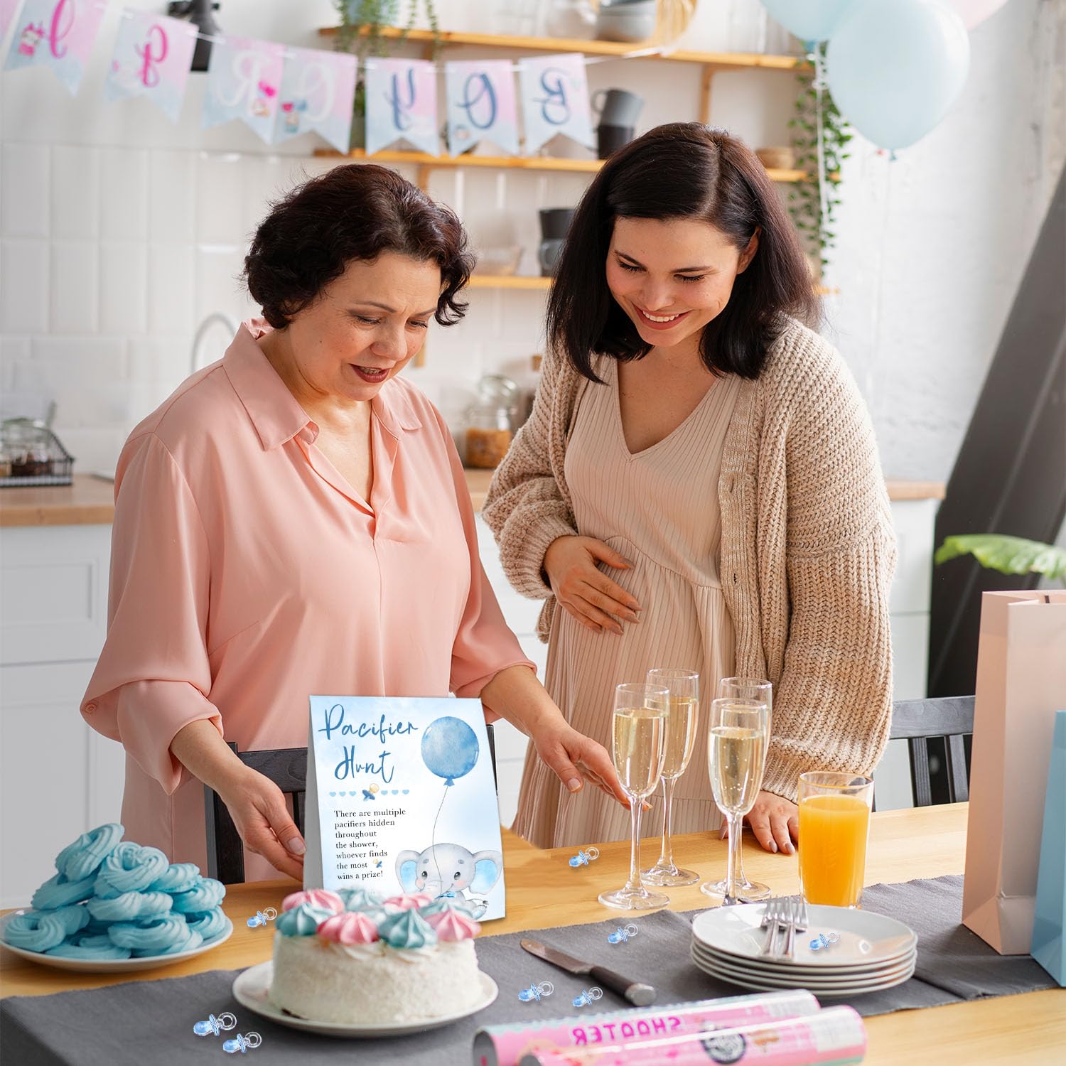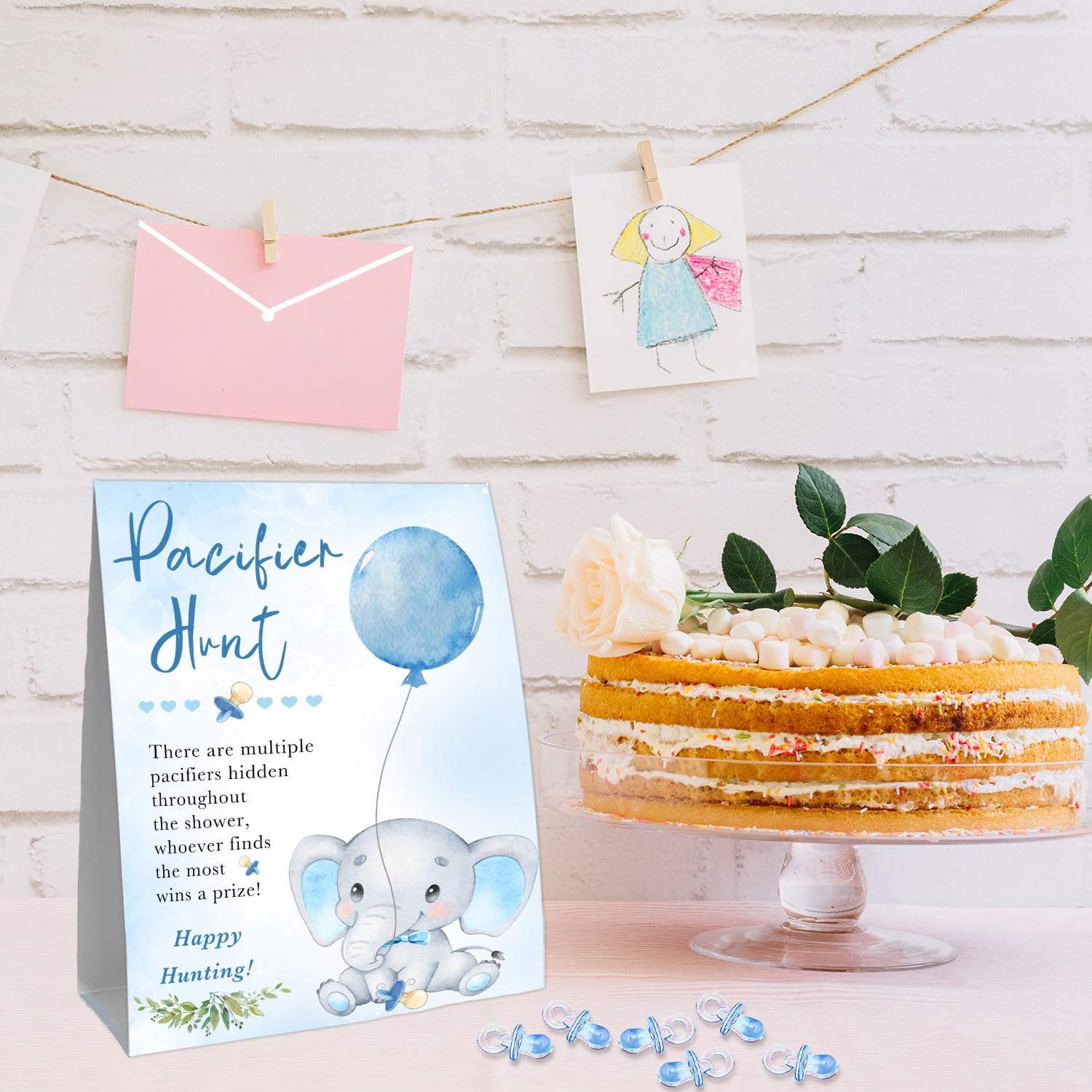 - Q: Is this product suitable for a boy's baby shower? A: Yes, the blue mini pacifiers and the design themes make it suitable for a boy's baby shower.