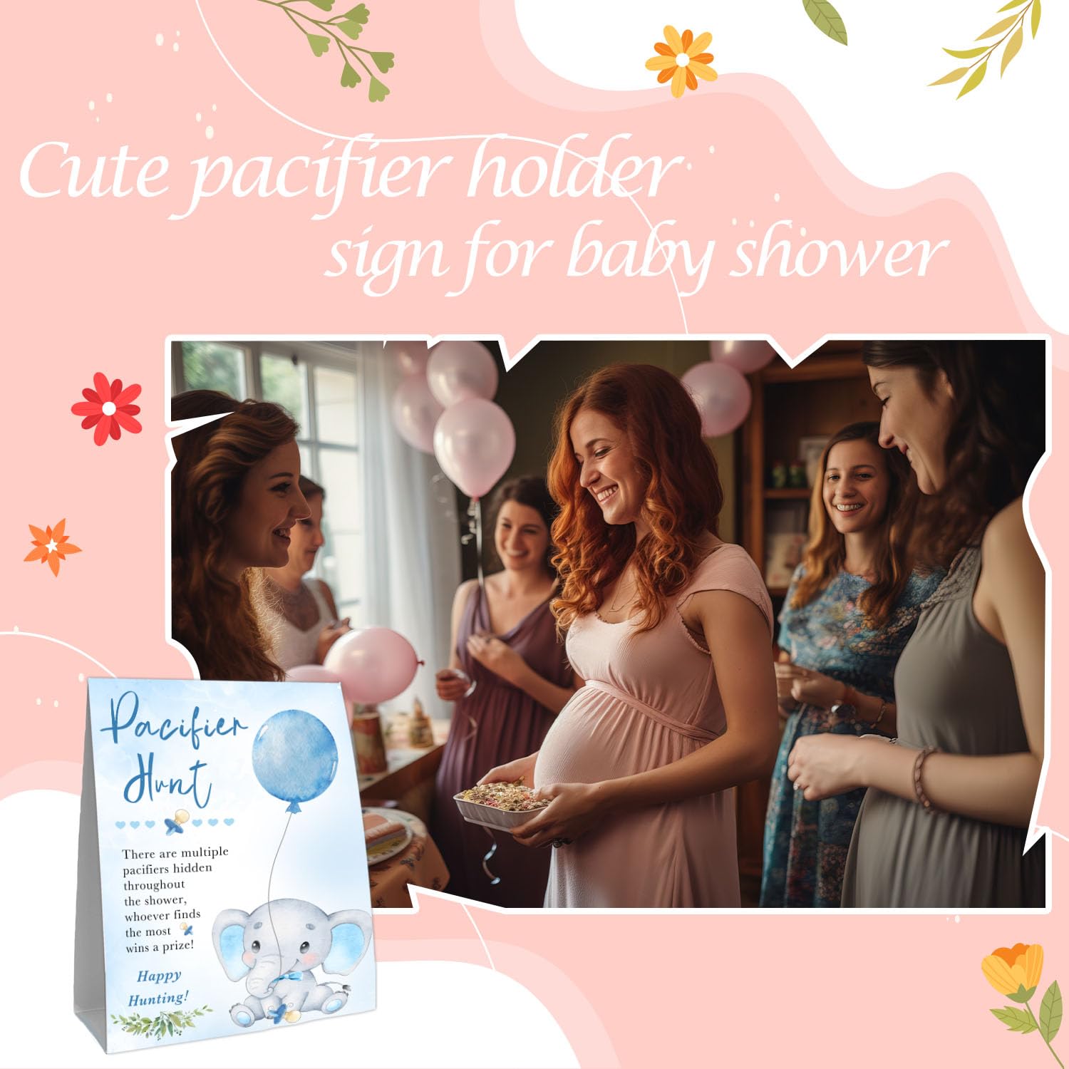 - Q: What themes do the baby pacifier signs feature? A: The baby pacifier signs feature cute bear, elephant, and other animal designs, which fit well with baby shower themes.