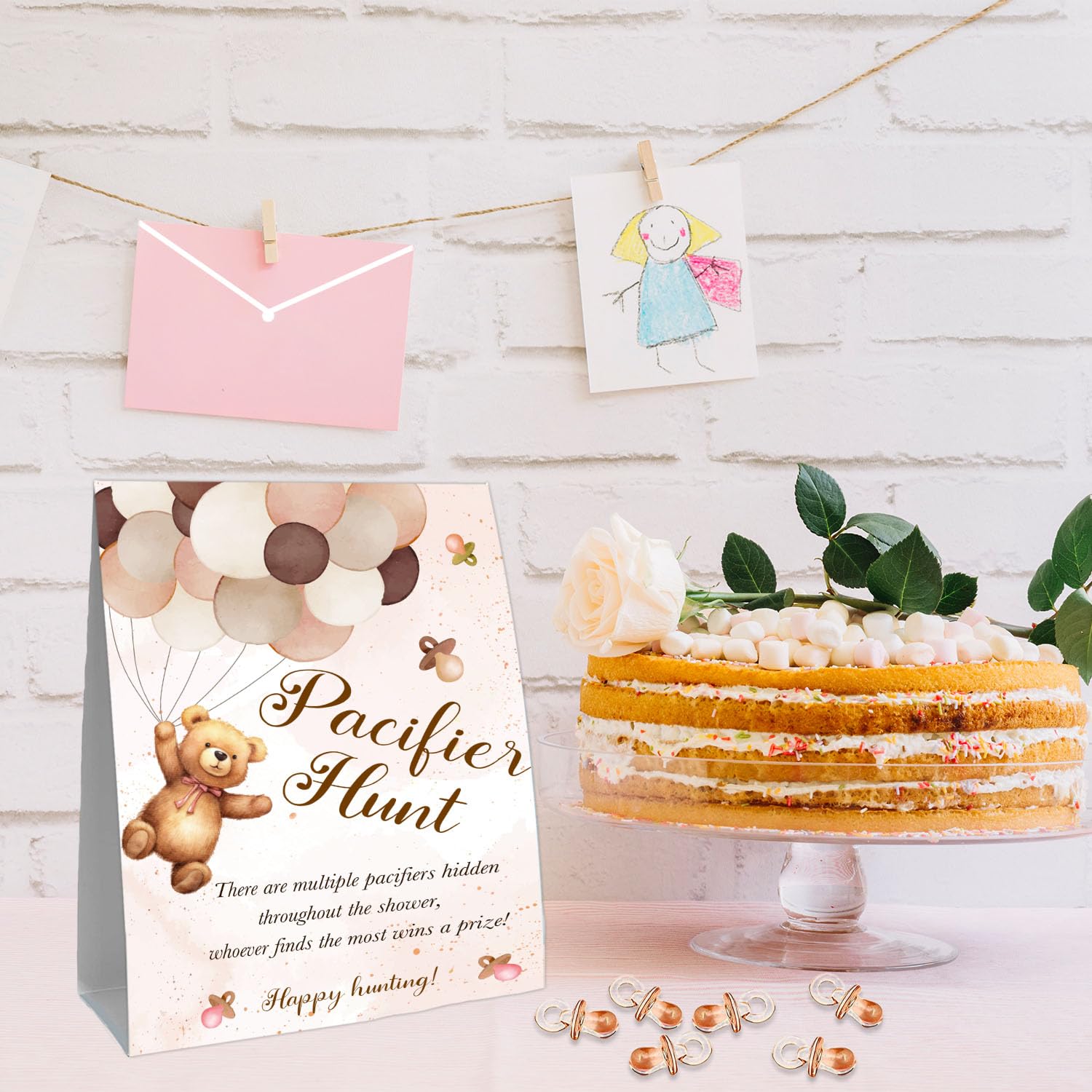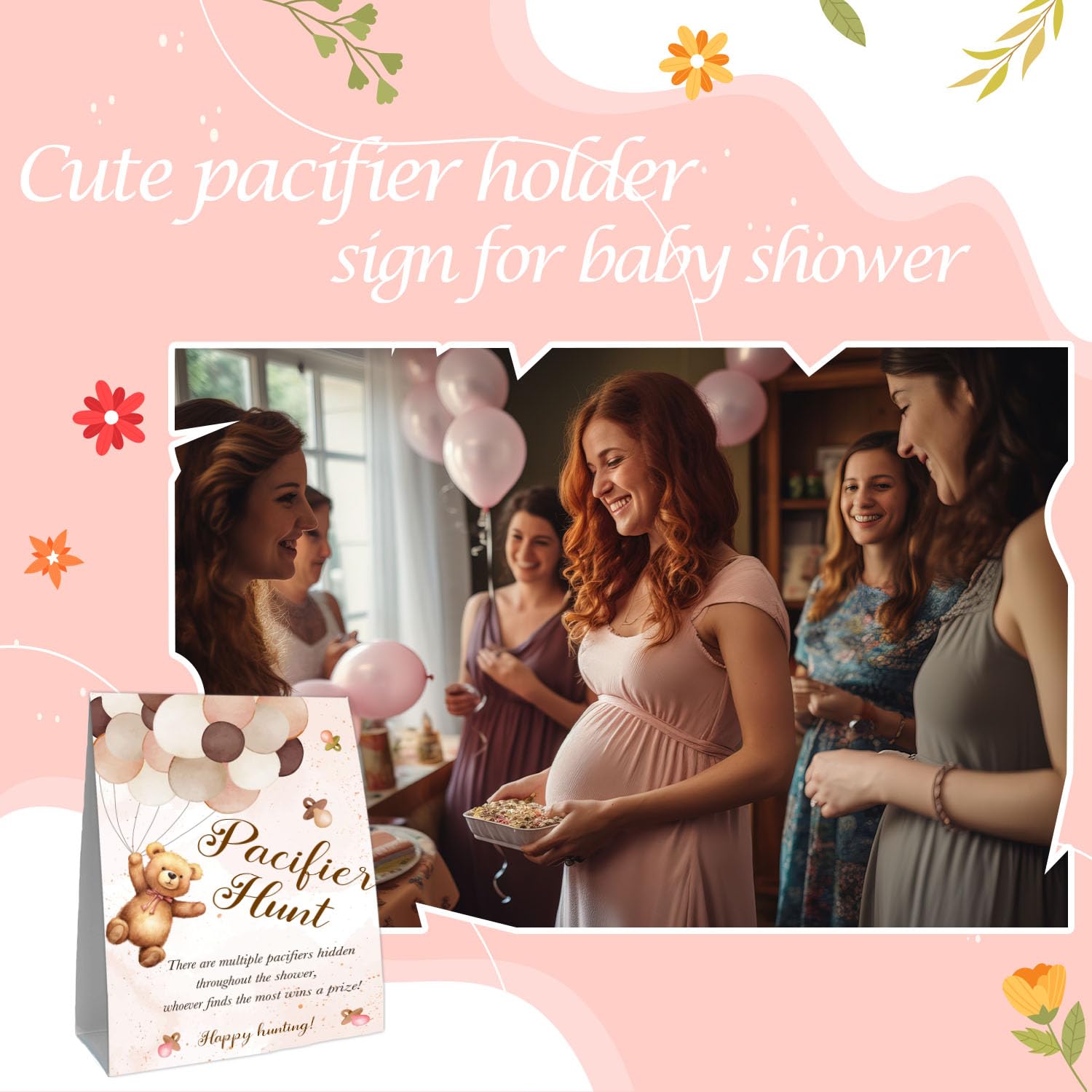 - Q: What themes do the designs on the pacifier hunt sign feature? A: The sign features cute animal designs such as bears and elephants, which align well with baby shower themes.