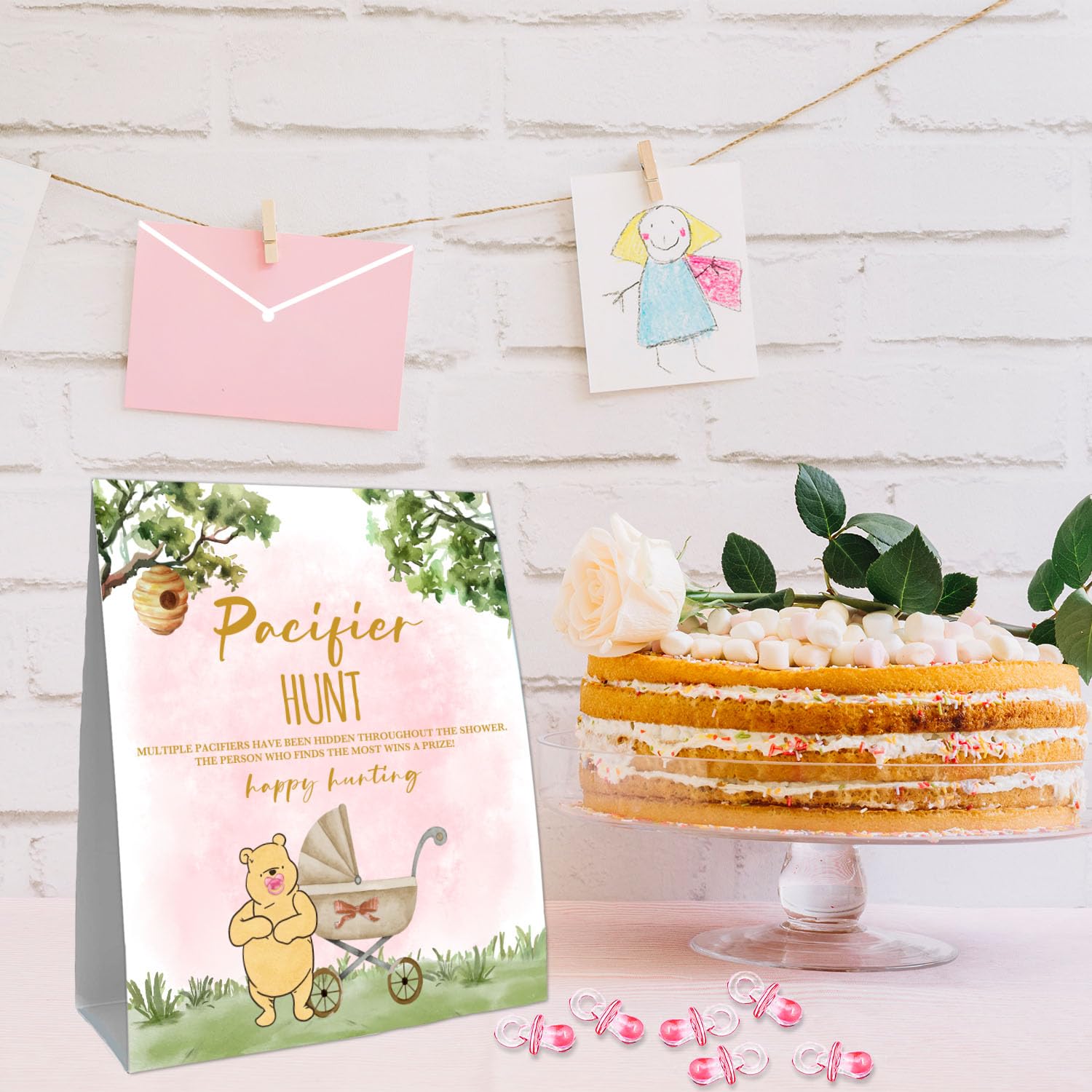 - Q: What is included in the Guawubiang Winnie Pacifier Hunt Sign set? A: The set includes a double-sided sign measuring 8 by 10 inches and a pack of 50 pink mini pacifiers.