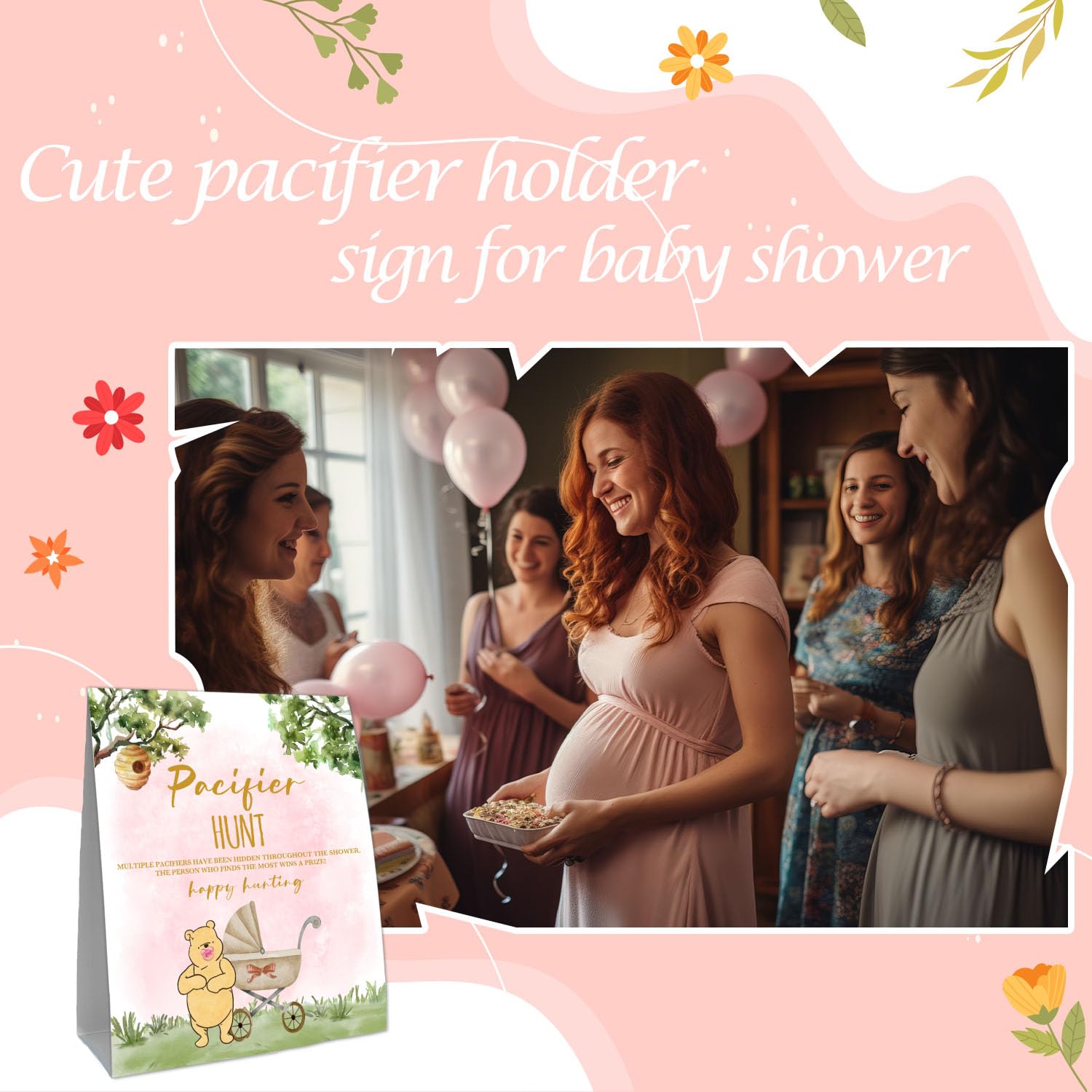 - Q: What is the purpose of the mini pacifier hunt sign? A: The mini pacifier hunt sign is intended to be used as a game at baby showers, encouraging guests to find hidden mini pacifiers as part of the festivities.