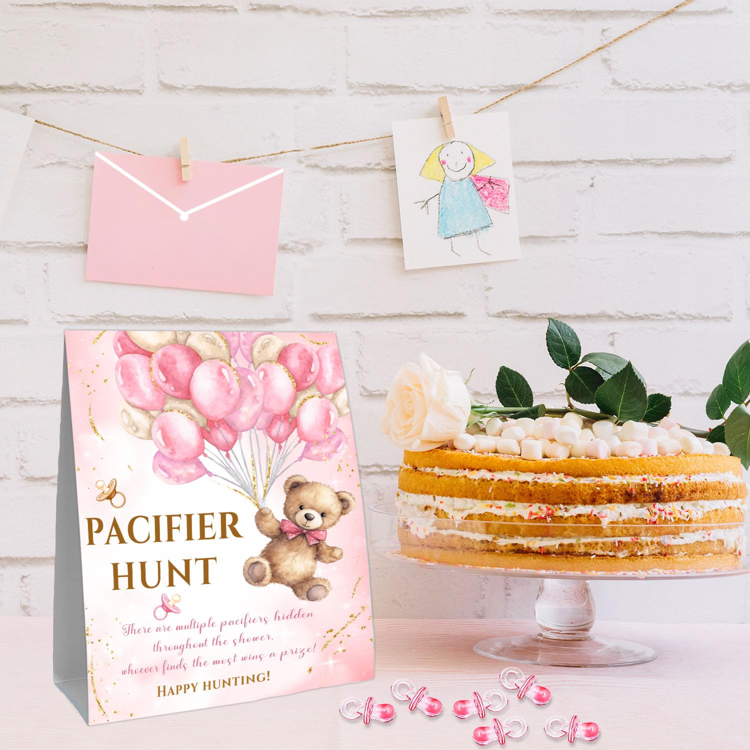 - Q: What is included in the Guawubiang Winnie Pacifier Hunt Sign set? A: The set includes a double-sided sign measuring 5 by 7 inches and a pack of 50 pink mini pacifiers.