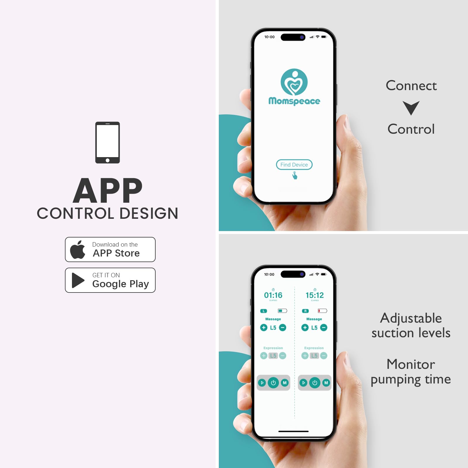 - Q: How does the app control feature work? A: The Momspeace breast pump's smart app allows you to control the pump from your phone, where you can adjust the suction level, monitor pumping time, and check battery life without needing to access the pump directly.