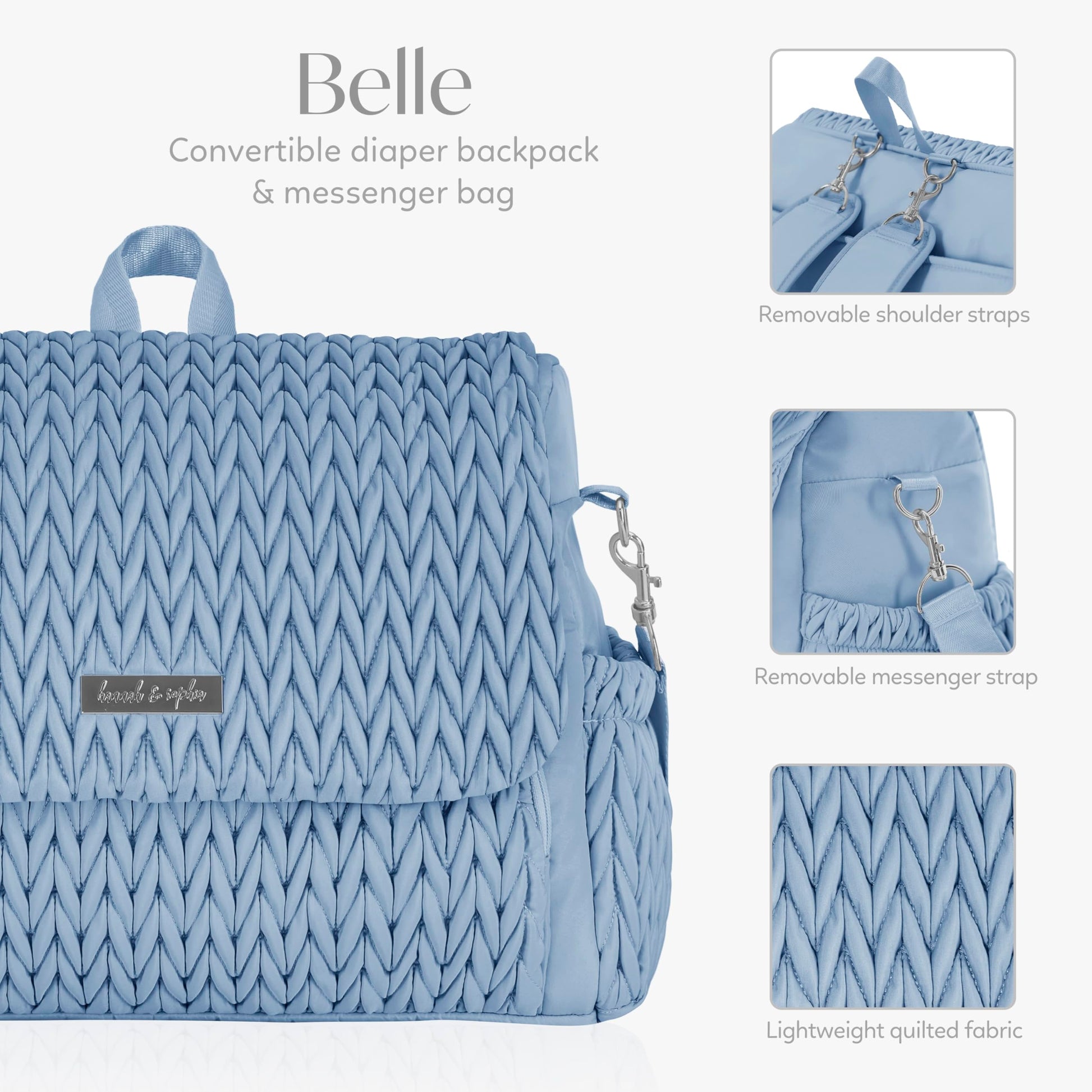 - Q: What is the size of the Hannah & Sophia Belle Convertible Diaper Bag? A: The dimensions of the Hannah & Sophia Belle Convertible Diaper Bag are 16 inches wide, 7.5 inches deep, and 12.5 inches high.