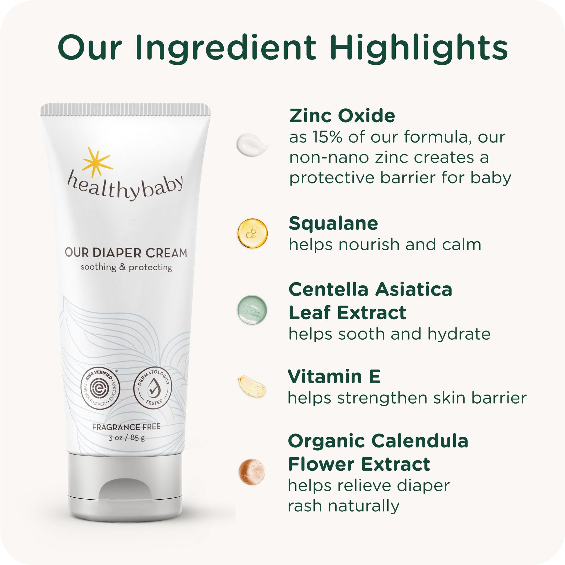 • Q: What are the key ingredients in HealthyBaby Diaper Cream? A: HealthyBaby Diaper Cream contains 15% non-nano Zinc Oxide and plant-derived Squalane, along with organic sunflower and coconut oils, and organic calendula.