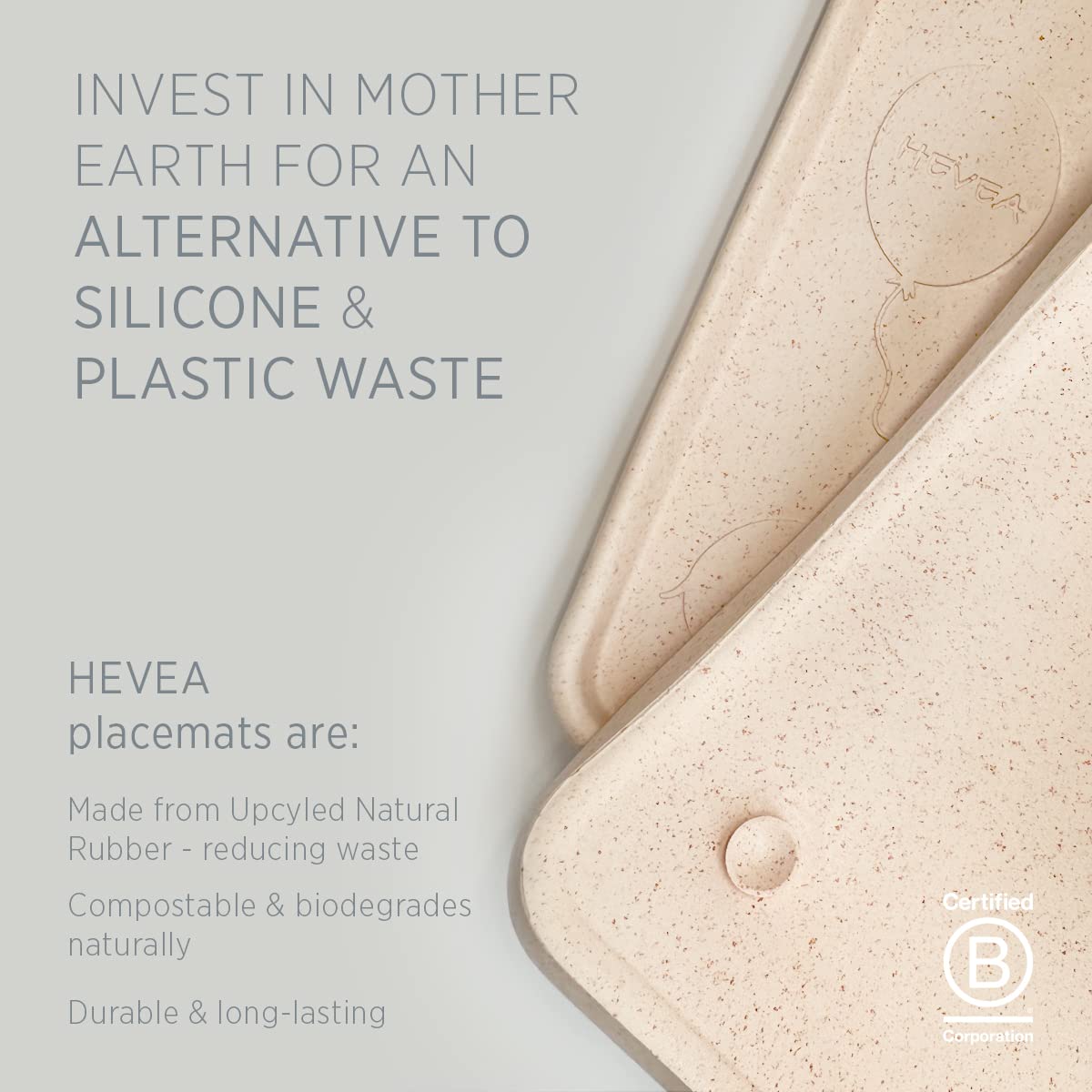 • Q: What material is the HEVEA Natural Rubber Kids Placemat made from? A: The HEVEA Natural Rubber Kids Placemat is made from 100% upcycled natural rubber, which is plant-based and vegan certified.