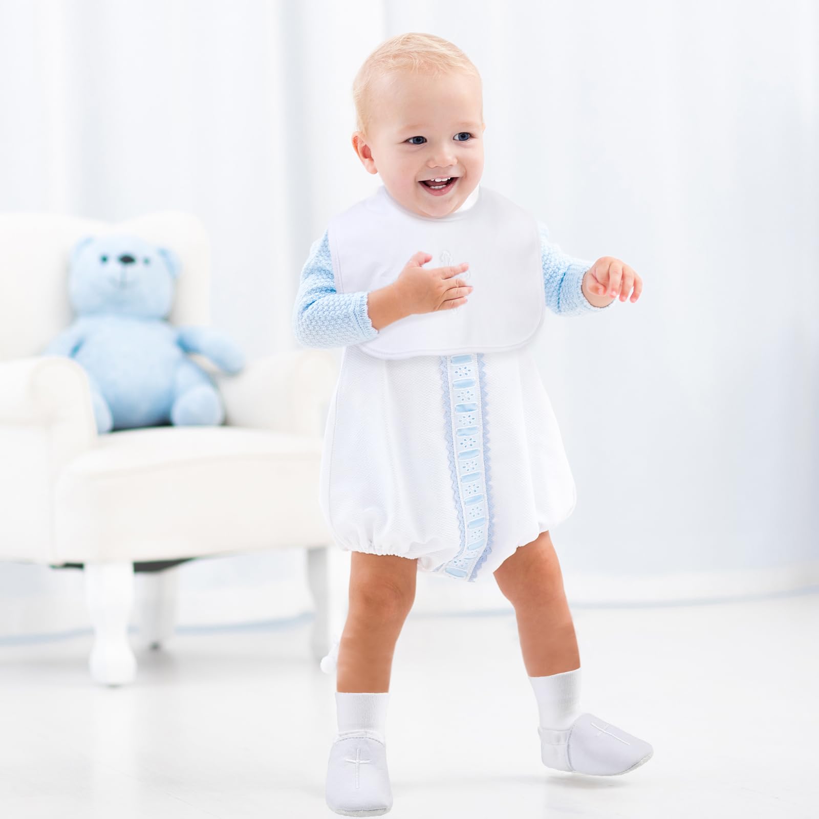 - Q: Can the bib and socks be used as photography props? A: Yes, the white bib and socks serve as ideal photography props for capturing memorable moments during your baby's baptism.