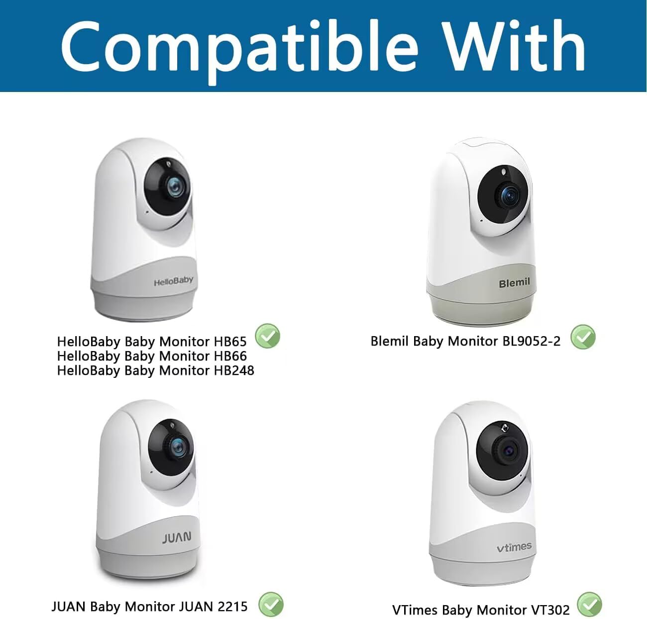- Q: What baby monitors are compatible with the HOLACA Flexible Clip Mount? A: The HOLACA Flexible Clip Mount is compatible with the Blemil Baby Monitor BL9052-2, JUAN Baby Monitor JUAN2215, Hellobaby models HB6550, HB65, HB66, HB248, VTimes Baby Monitor VT302, and ANMEATE SM935E Baby Monitor.