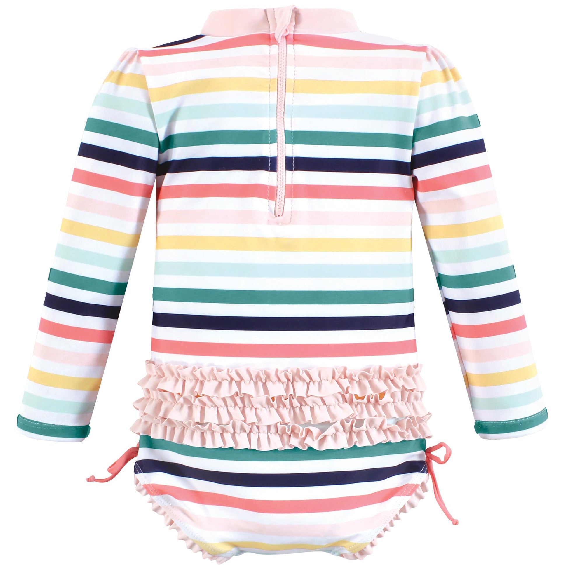 - Q: What sizes are available for the Hudson Baby Girls' Swimsuit? A: The swimsuit is available in a wide range of sizes from 3-6 months to 7 years.