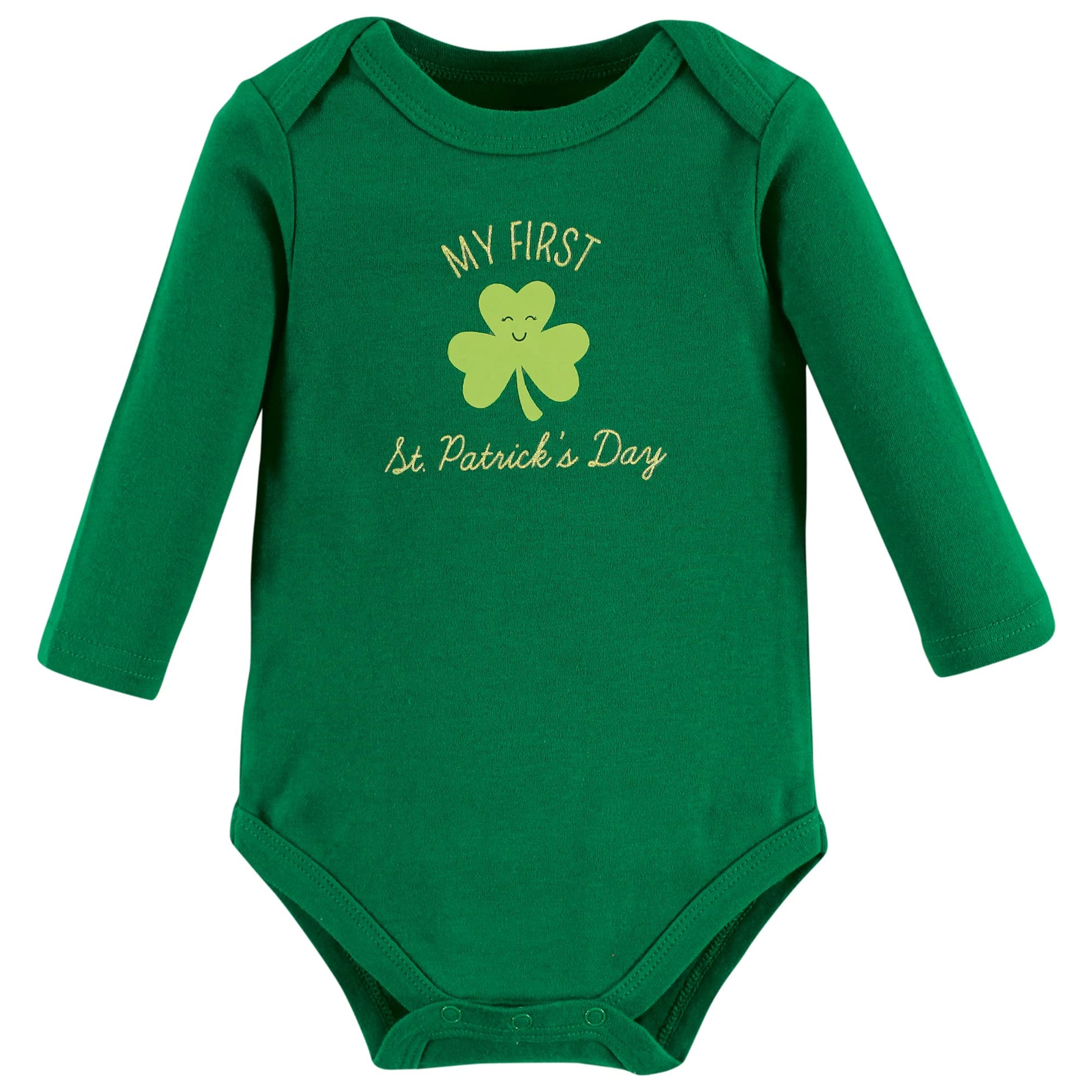 - Q: What colors and designs are available for these bodysuits? A: The Hudson Baby bodysuits feature a variety of adorable prints, including the St. Patrick's Rainbow design.