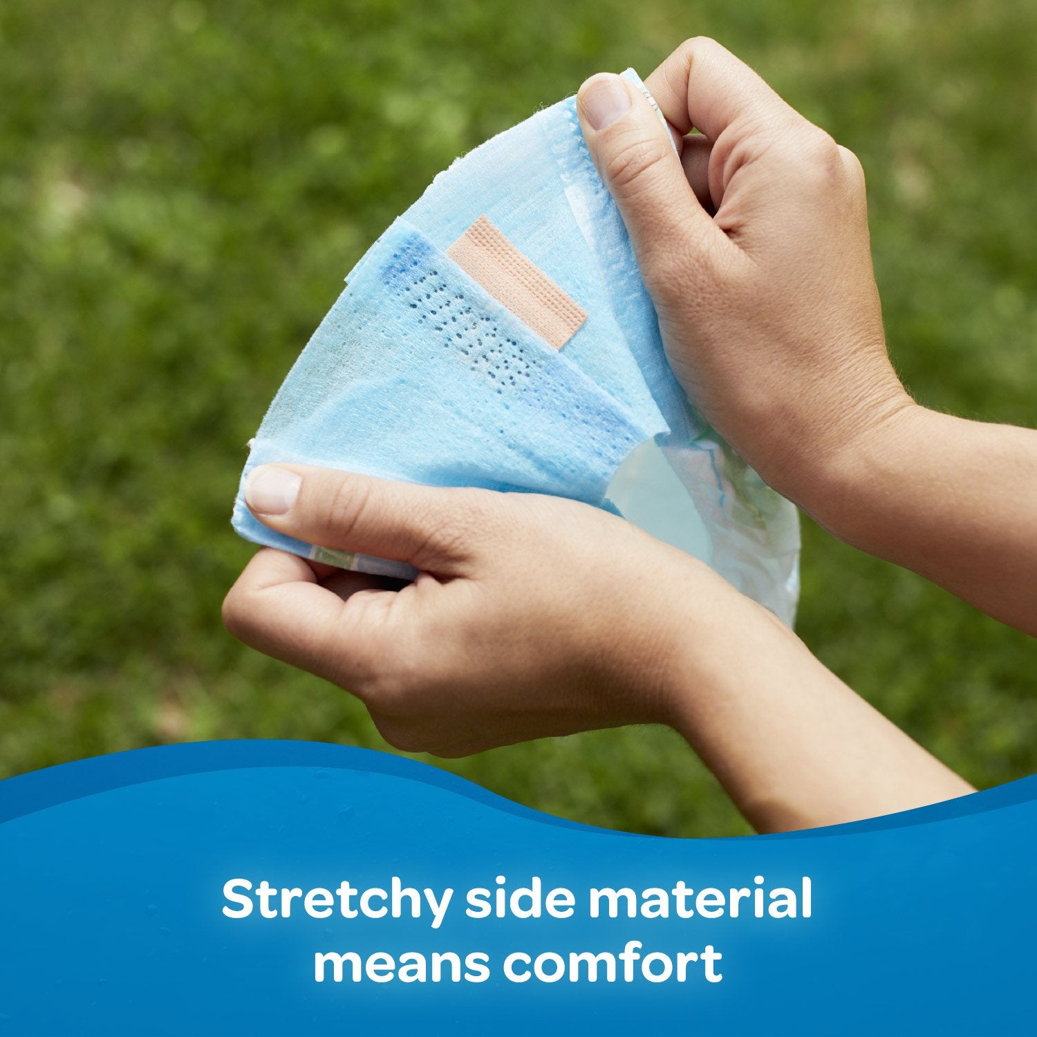 Why swell up like a beach ball when you're playing in the water? HUGGIES Little Swimmers swim pants protect in the water without swelling up like disposable diapers do. And now with Disney designs -even more fun! Available in three sizes to fit infants and toddlers: Small (16-26 lbs.), Medium (24-34 lbs.) and Large (32+ lbs.)