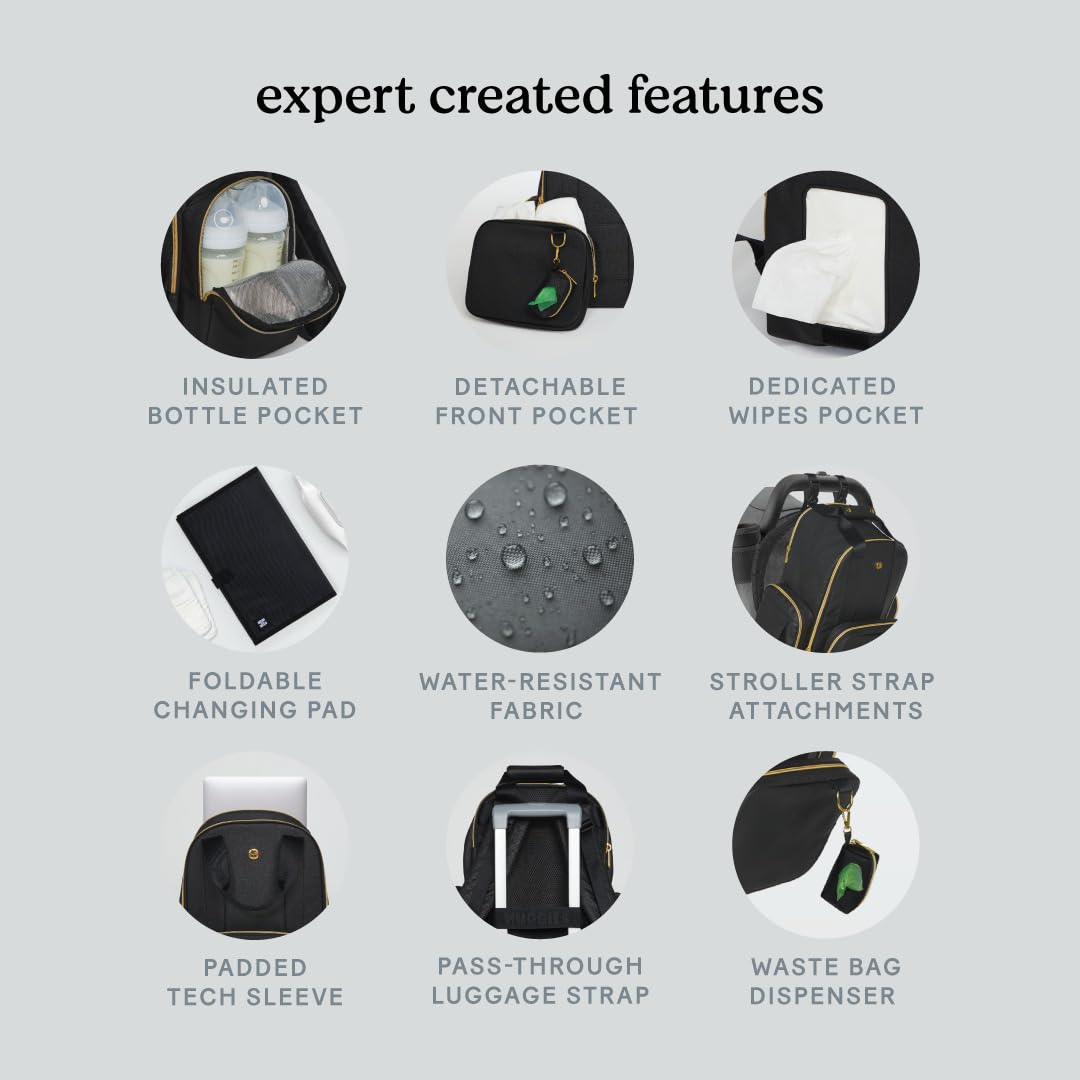 - Q: What features help with changing diapers on-the-go? A: The backpack includes a foldable changing pad and a change-and-toss dispenser to assist with quick changes while you are out.