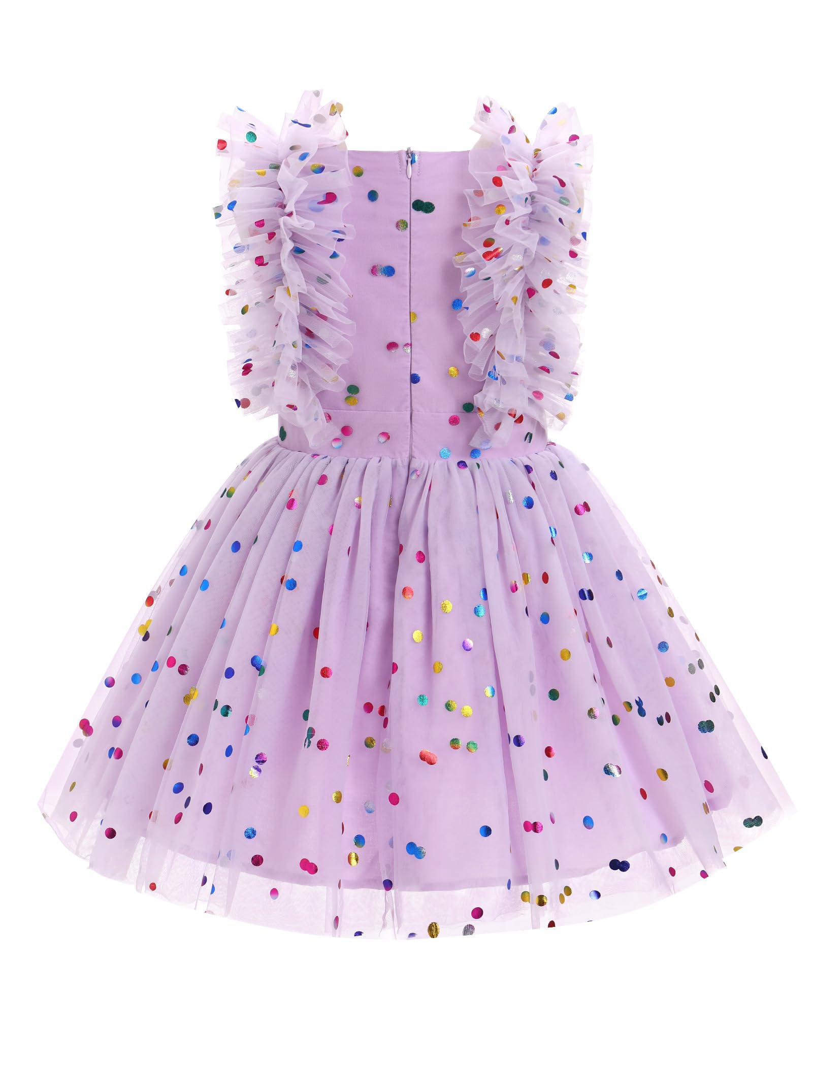 - Q: Does this dress have any special features? A: The dress features flutter sleeves, ruffles, layered tulle, and a hidden back zipper for a stylish and comfortable fit.