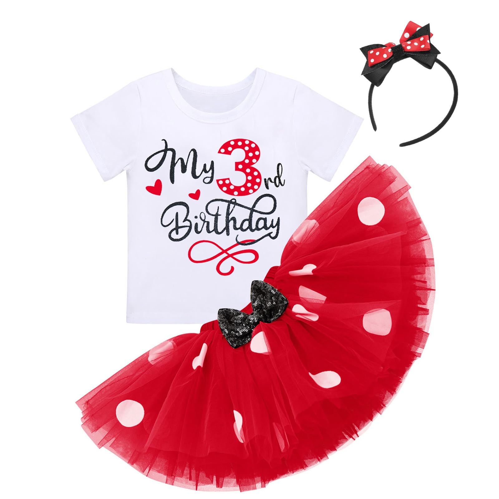 Ibtom Castle Toddler Baby Girls 3Rd Birthday Princess Outfit Polka Dots T-Shirt Top Tutu Skirt Set Ears Headband Third Years Old