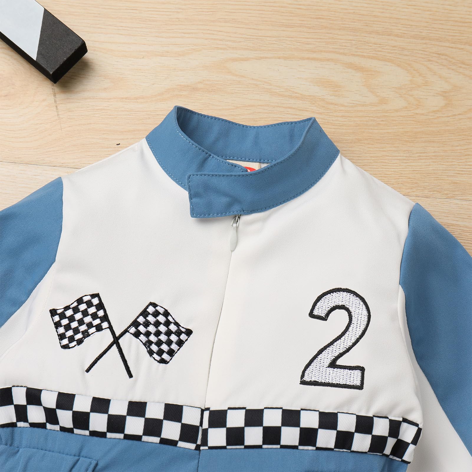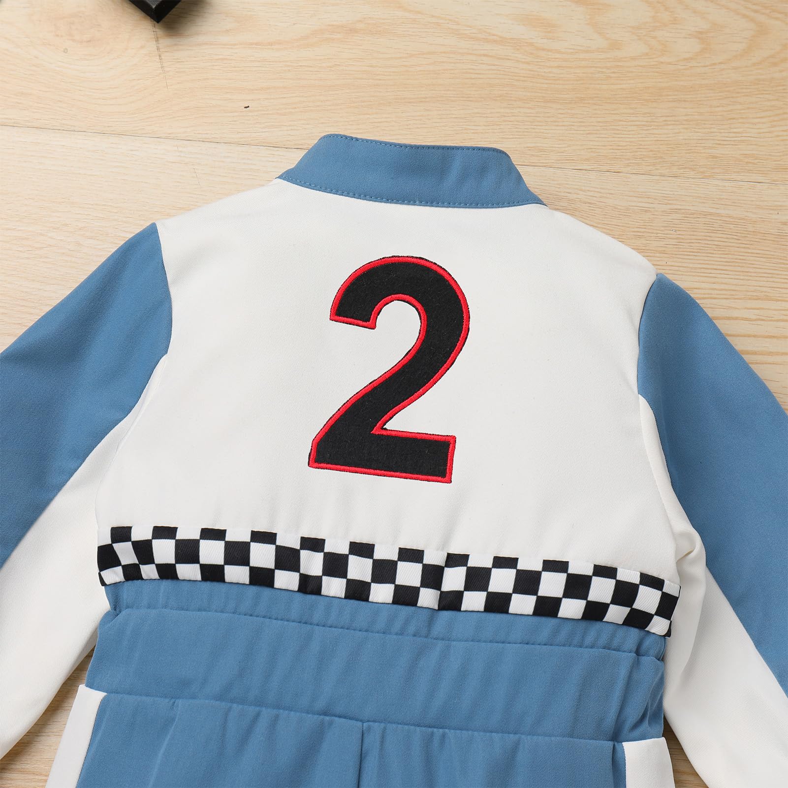 - Q: What is the design of the jumpsuit? A: The jumpsuit features a mandarin collar, long sleeves with elastic cuffs, and a check flag pattern with the numbers '1' and '2'.