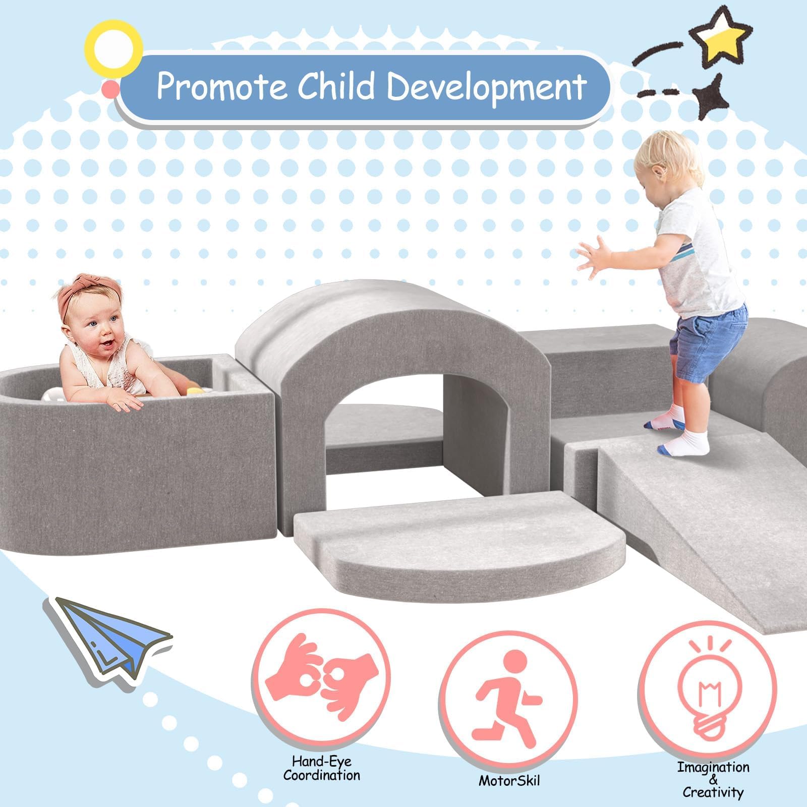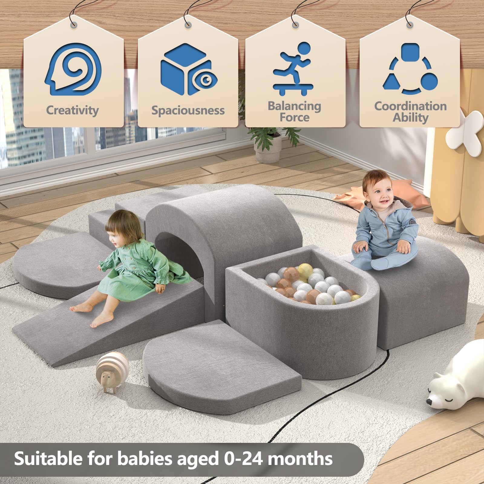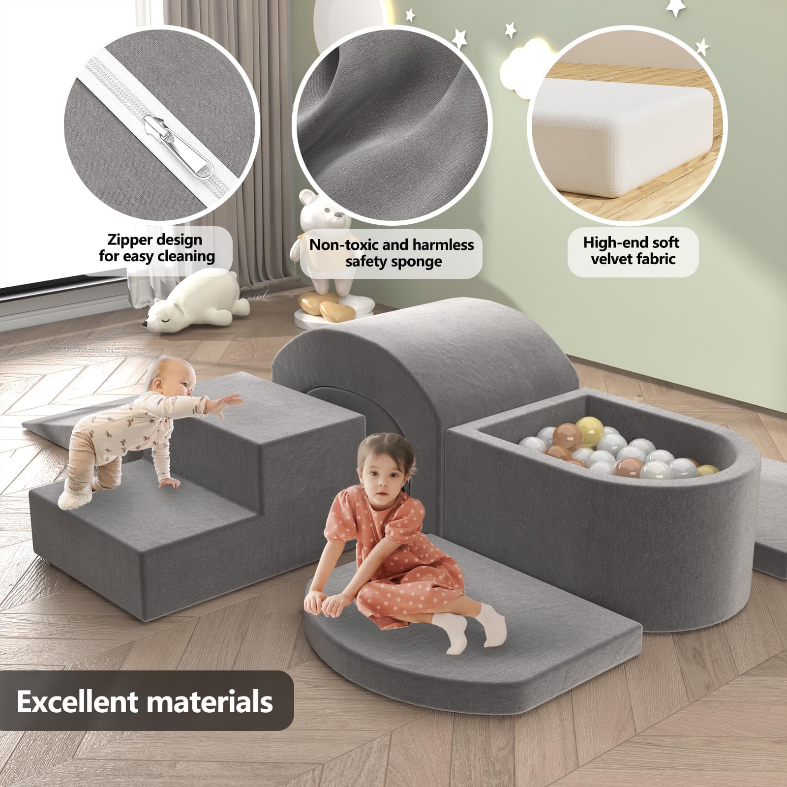 Introducing our exclusive 7-piece sponge climbing toy set, an adventure-filled playground designed for your toddler's safety and development. Perfect for children aged 1 to 3, this indoor playset includes a ball pit and various climbing shapes that promote physical activity and stimulate cognitive growth. Crafted from high-quality, CertiPUR-certified foam, each climbing block is covered in soft, luxurious velvet fabric thats both visually appealing and gentle to the touch, ensuring a safe play environment. Unlike traditional play equipment, our set is vacuum compressed for eco-friendly shipping and requires no assembly. Simply open the package, and the set will expand to its full form within 48 hours. The versatility of this set is endless. Toddlers can explore tunnels for crawling and sliding, climb the stairs and ramp, and enjoy the ball pits added fun. As your child grows, the components can be rearranged to further challenge their motor skills, balance, and creativity. Designed with safety in mind, the climbing blocks feature rounded edges, a non-slip base, and no sharp corners, giving parents peace of mind. These blocks arent just a source of fun but are also a tool for developing gross motor skills, balance, and cognitive abilities in an engaging way. Ideal for homes, daycares, preschools, and kindergartens, this climbing toy set is more than just a playset-its a developmental tool that fits seamlessly into any learning environment. It makes the perfect gift, offering both fun and educational benefits, and provides hours of entertainment. Whether in a playroom, classroom, or special corner of your home, our climbing toy set encourages exploration, fosters independence, and stimulates imaginative play, making it an invaluable addition to your childs playtime activities.