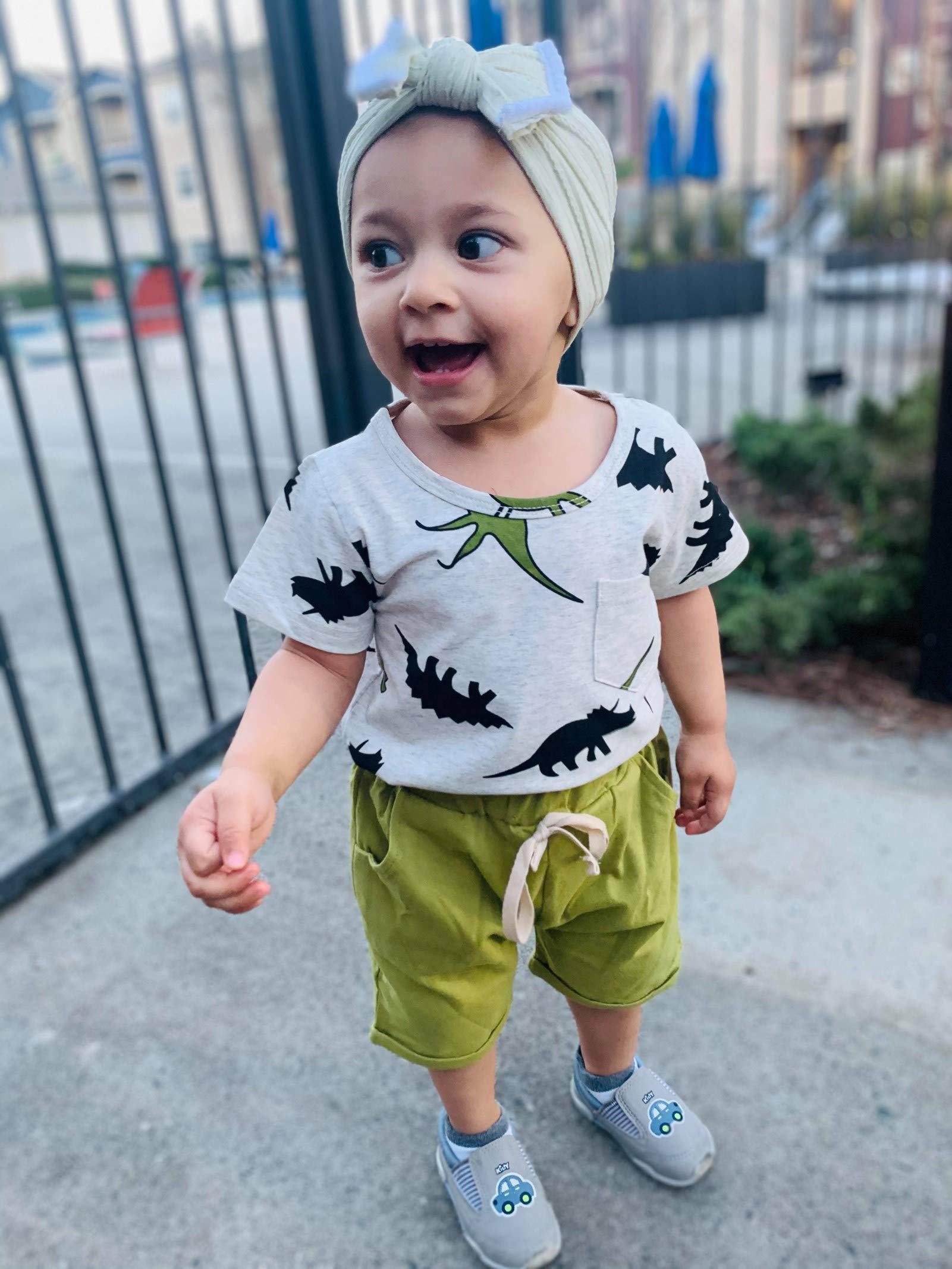 • Q: Does this set come with any accessories? A: The package includes a Dino printed top and a pair of shorts, making it a complete two-piece outfit.