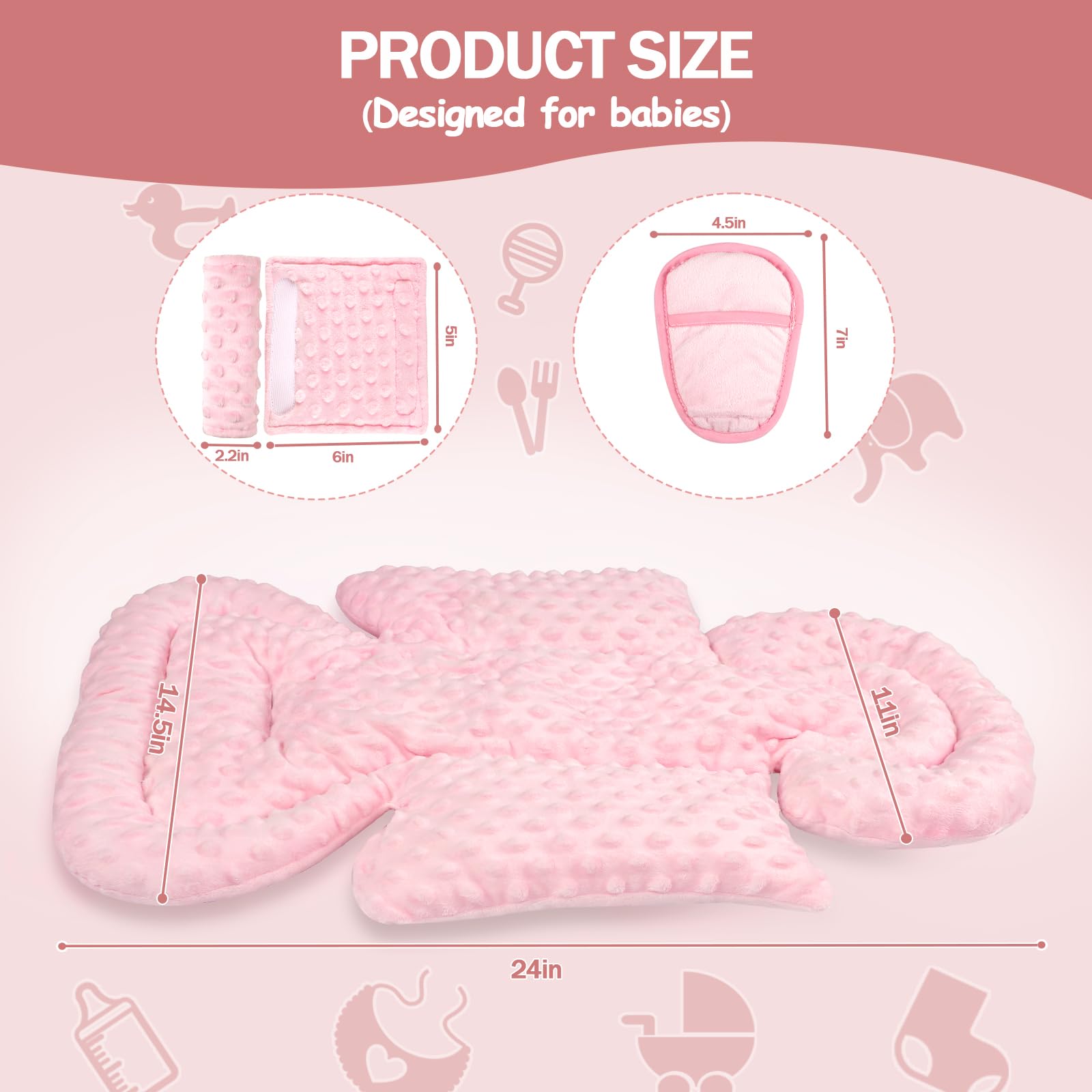- Q: What are the dimensions of the car seat insert and strap covers? A: The car seat insert measures 24 inches by 14.5 inches, the strap covers are 5 inches by 6 inches, and the protective pad is 4.5 inches by 7 inches.