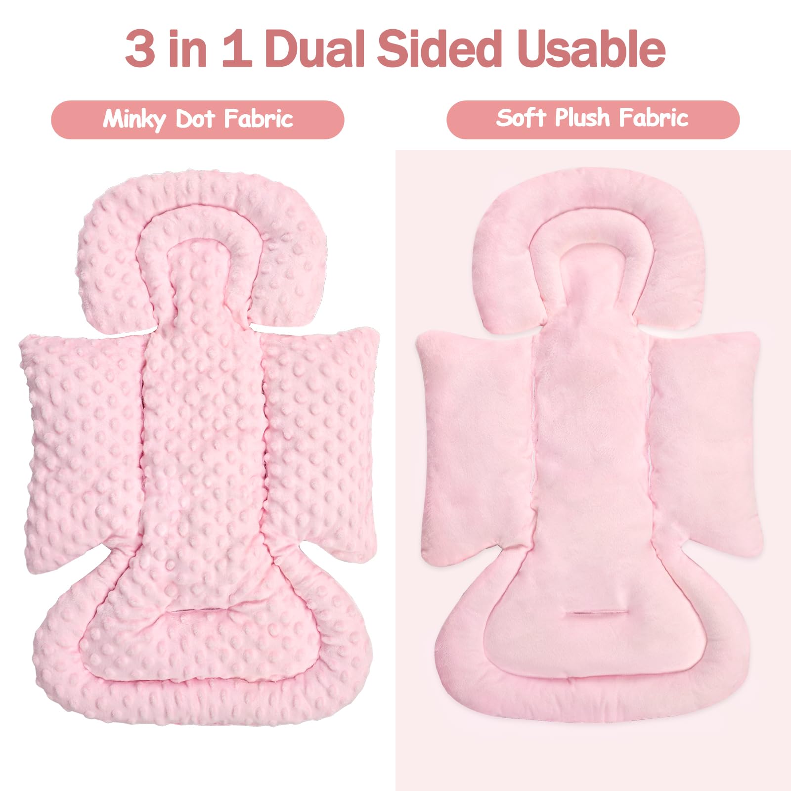 - Q: What materials are used in the car seat insert? A: The insert is made from different plush fabrics, featuring one side that is soft and plush and another side that has a dot texture.
