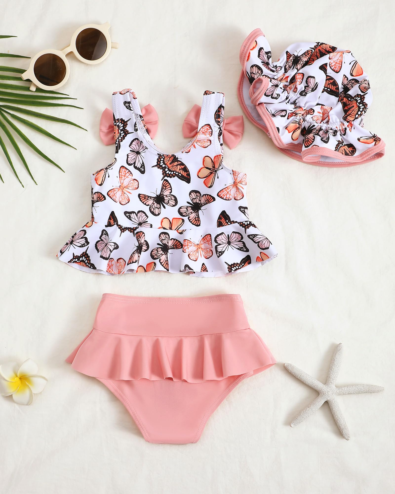 - Q: What is the design of the swimsuit like? A: The swimsuit features a sleeveless tankini design with a cute pattern, matching ruffle bottoms, and a lovely ruffle hat.