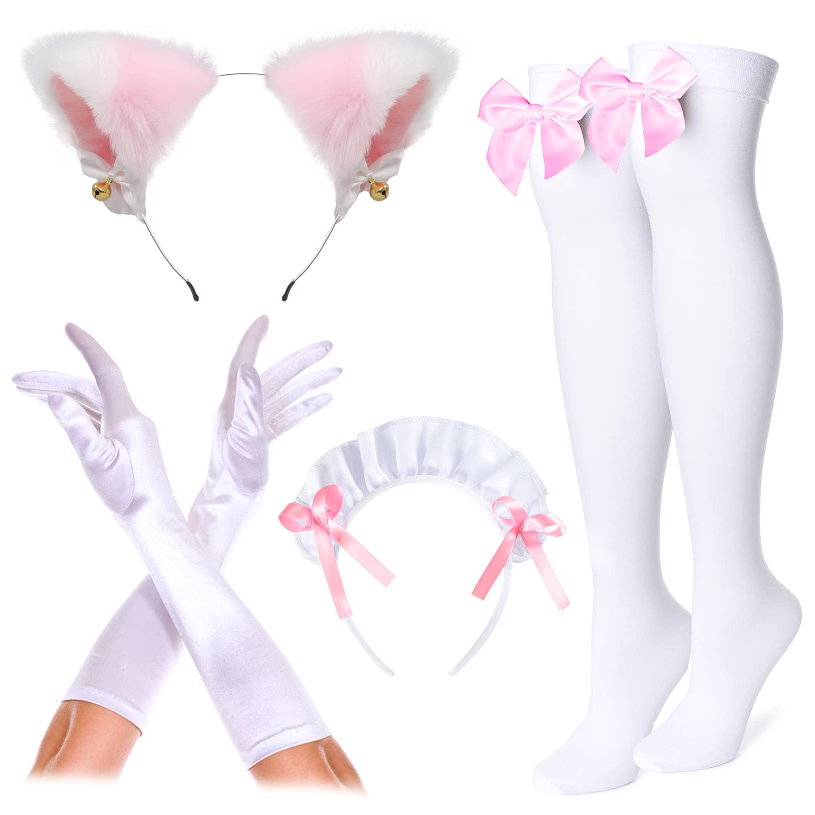 - Q: What accessories are included with the costume dress? A: The costume package includes a dress, apron, faux furry cat ears headwear, French maid headwear, a pair of bow-knot over-the-knee high socks, and satin smooth gloves, making it an 8-piece set.