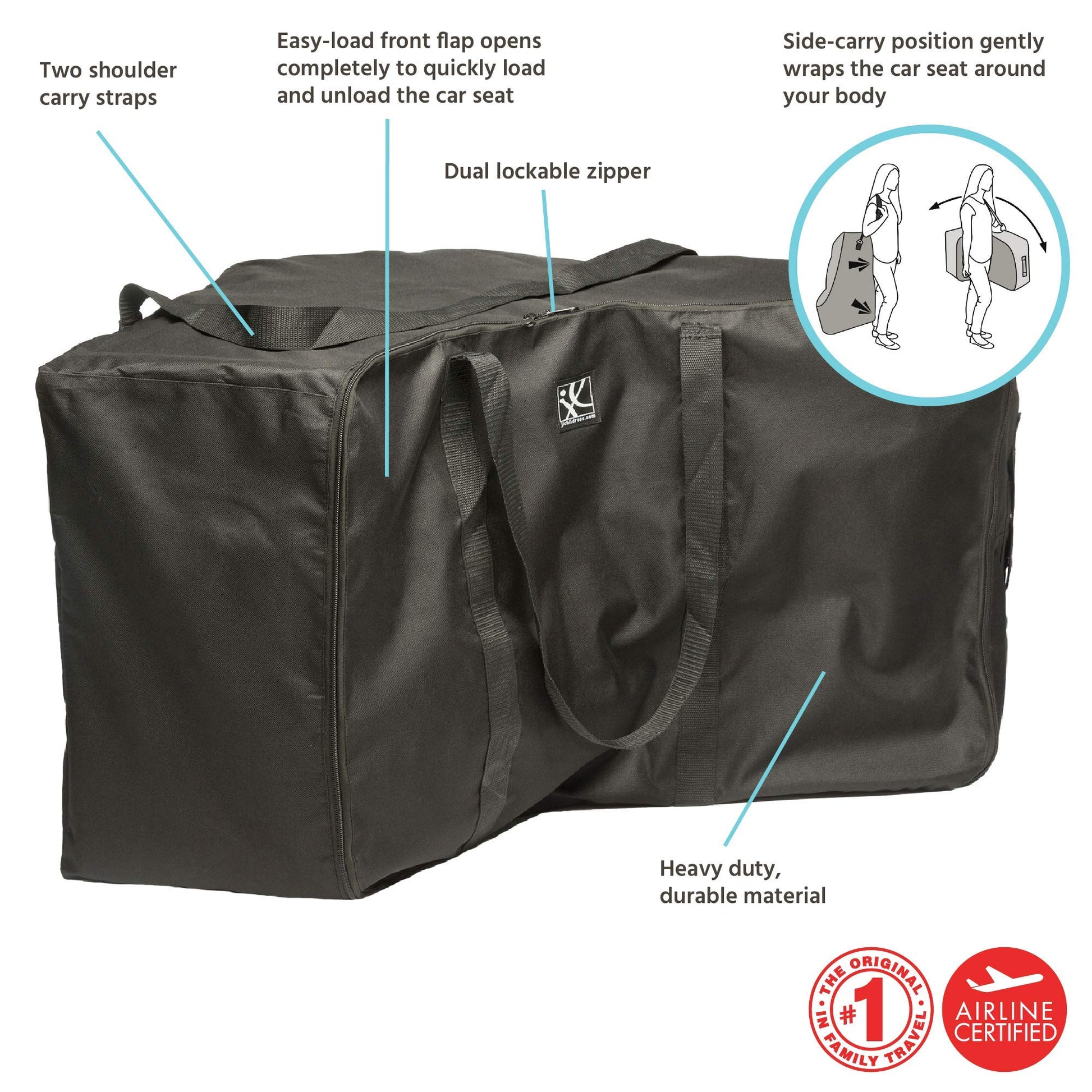 - Q: What features make this travel bag easy to use? A: The bag features two shoulder carry straps for convenience and an easy-load front flap that opens completely for quick loading and unloading of the car seat.