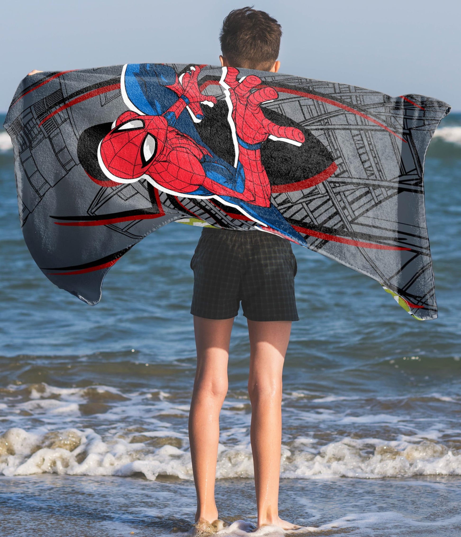 Bring your child's favorite superheroes to the beach with our ultra-soft, absorbent Kids' Spiderman Beach Towel! This 100% cotton towel features an eye-catching, full-color print of Spiderman from the comics and show that kids love. The large 28' x 58' size provides ample coverage for little ones to dry off after a day of splashing in the waves or relaxing on the sand. The plush, quick-drying material keeps them cozy and comfortable, while makeing it easy to display or air dry between uses. This versatile beach towel also doubles as a bath towel, pool towel, or picnic blanket, making it a must-have essential for family fun in the sun. Constructed from premium, fade-resistant cotton, this durable towel is built to withstand repeated use and washes without losing its vibrant colors or soft feel. The reinforced edges prevent fraying, ensuring long-lasting use season after season. Machine washable for easy care, it's a practical yet playful addition to your child's summer gear. Whether at the beach, pool, lake, or waterpark, this character-themed towel will let your little one show off their favorite Avengers in style. Makes a great gift for birthdays, holidays, beach vacations, and more! Embrace the joy of the outdoors and let your child's imagination run wild with our high-quality Kids' Marvel Beach Towel. Upgrade their beach day essentials with this fun, functional, and family-friendly design that's sure to become a summertime favorite.