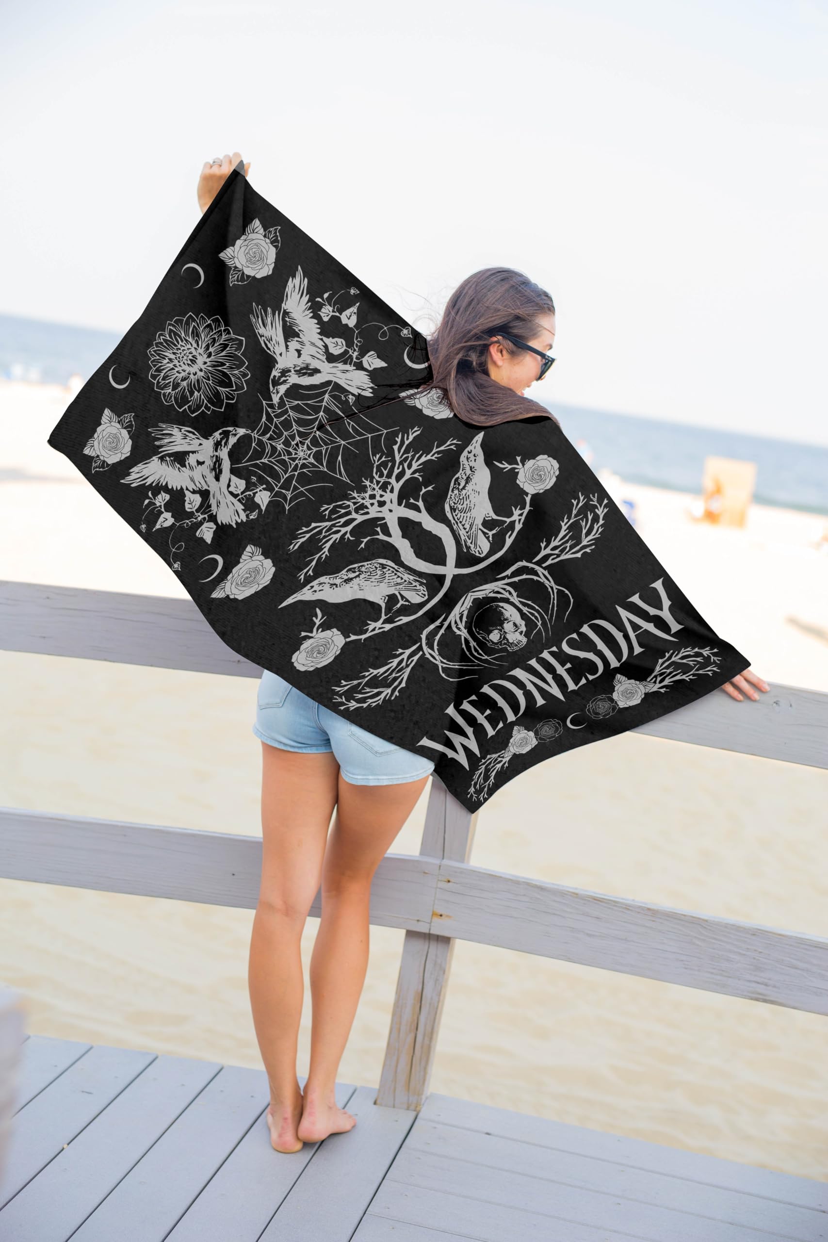 • Q: Does the towel have a special design? A: Yes, it features a spooky design with skulls and ravens, perfect for adding a gothic twist to summer activities.