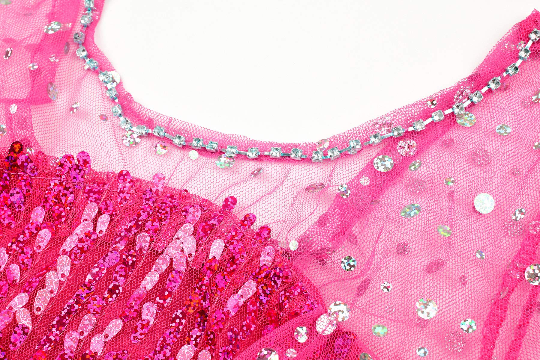 • Q: What design features does the costume have? A: The costume includes princess sequins, a neckline decorated with rhinestones, and a long train starting from the back.