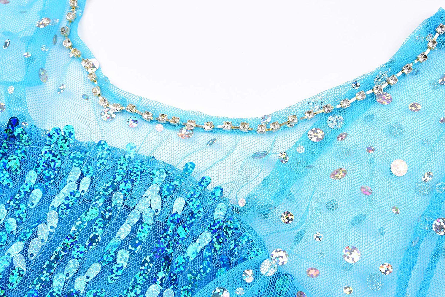 • Q: What unique features does this princess costume have? A: The costume features a decorated neckline with rhinestones, mesh sleeves, sparkling sequins all over, and a long train starting from the back.