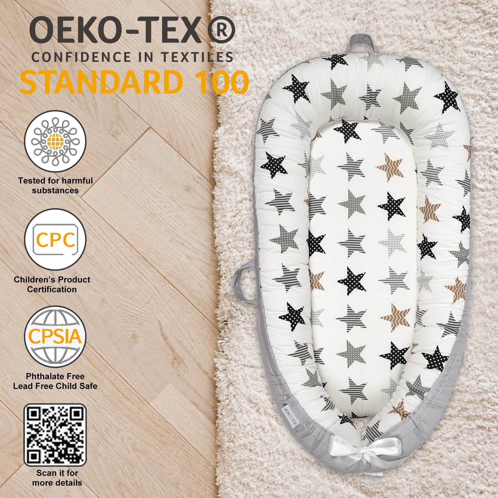 • Q: What materials is the baby lounger made of? A: The baby lounger is made of 100% breathable cotton for comfort and safety.