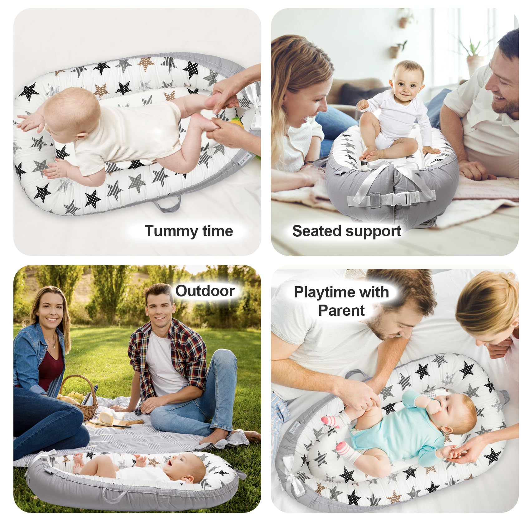 • Q: Is the baby lounger portable? A: Yes, the lightweight design and convenient handles make the baby lounger easy to carry, making it ideal for travel.