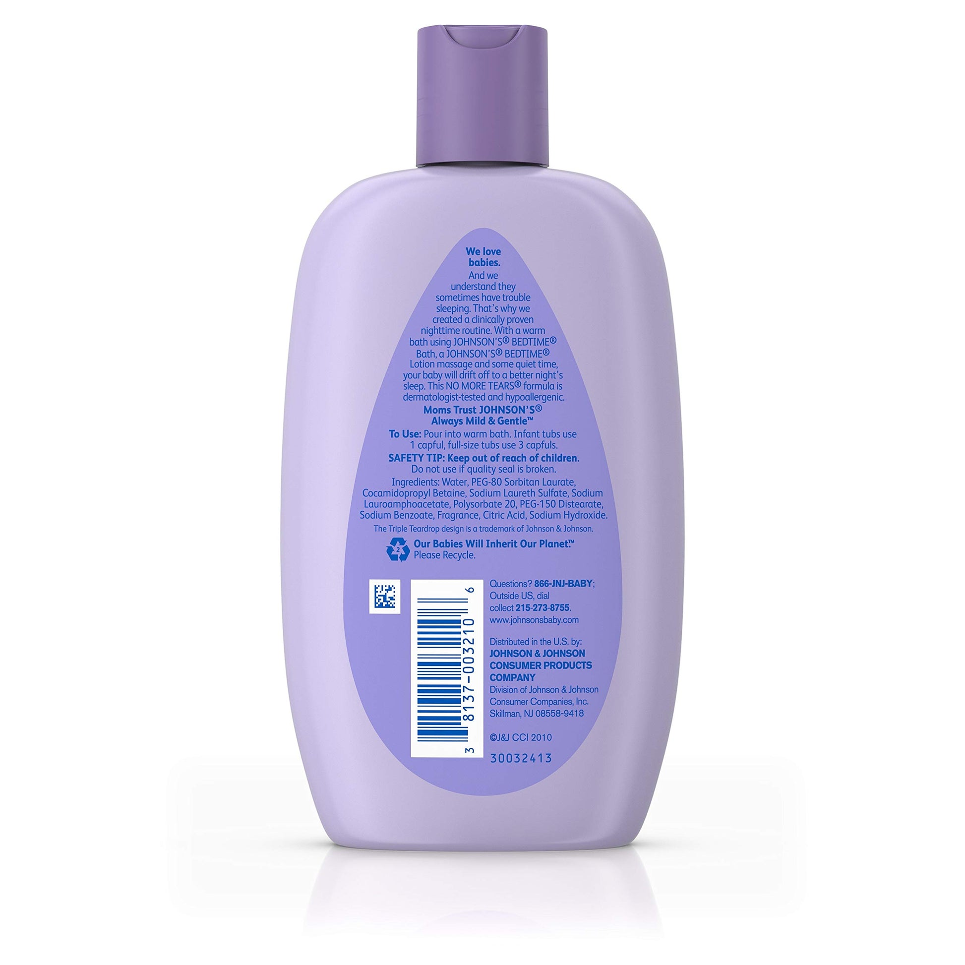 - Q: What are the key ingredients in Johnson's Baby Bedtime Bath? A: The key ingredients include lavender and chamomile, which are known for their relaxing and soothing properties, along with a gentle, No More Tears formula.