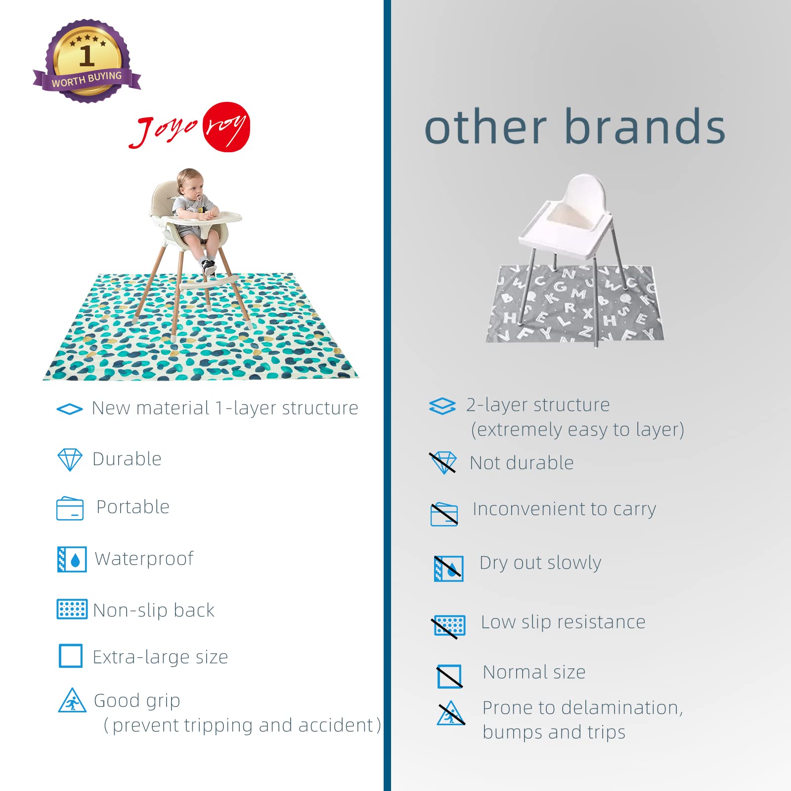 - Q: Does the mat help prevent mess during feeding? A: Absolutely! The mat helps catch spills and crumbs, keeping the area around the high chair clean and tidy.