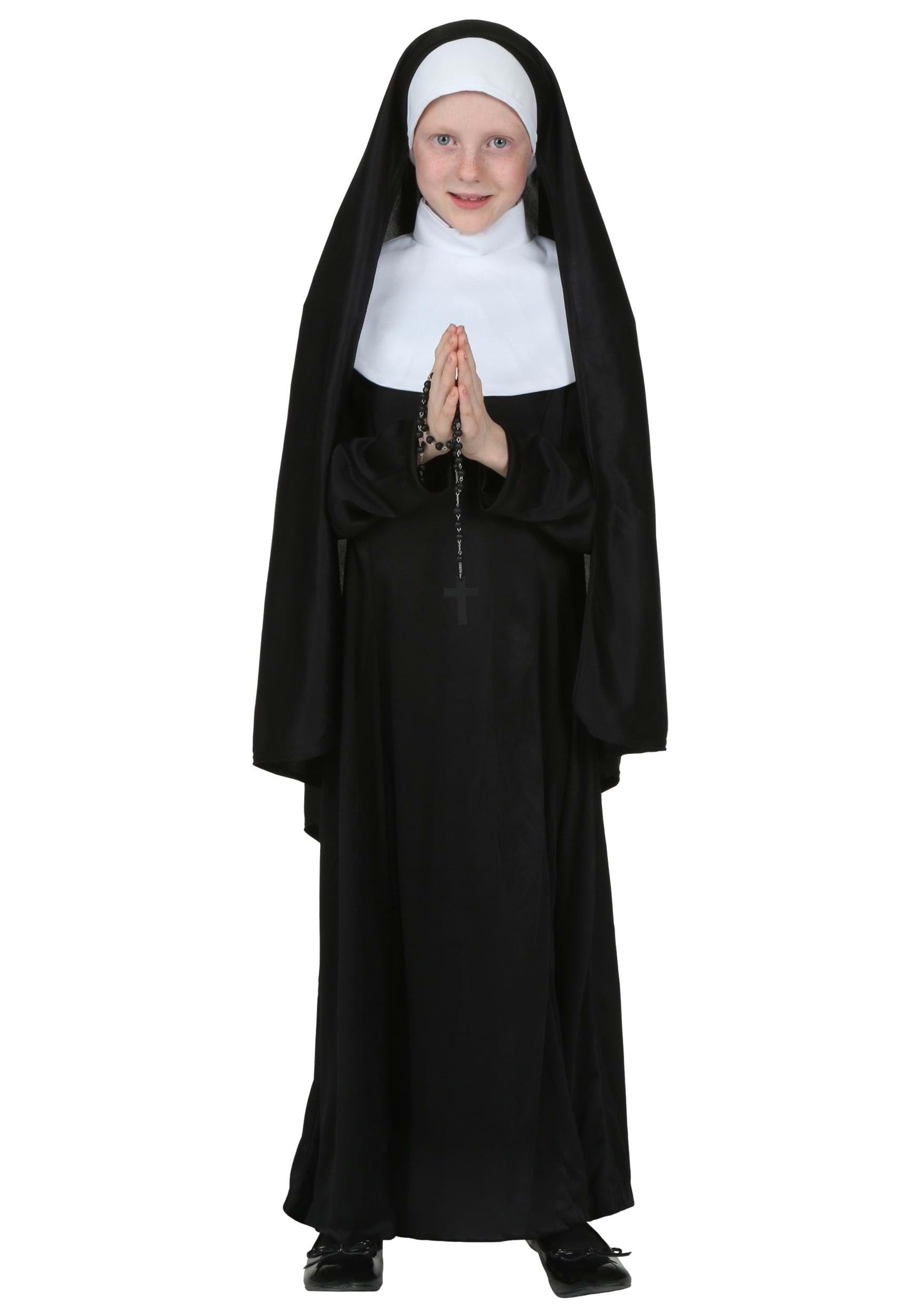 - Q: What is included in the Kids Nun Costume? A: The Kids Nun Costume includes a black long-sleeved dress, a white collar, and a veil that is sewn to a headband.