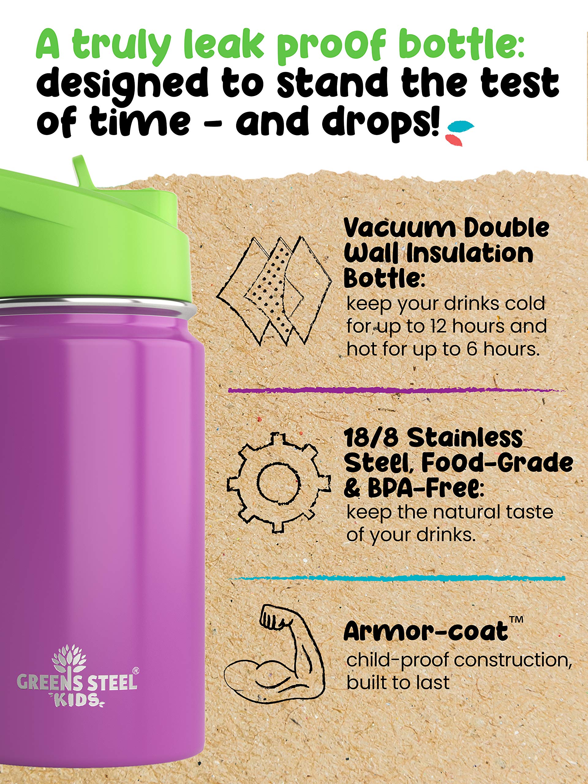 - Q: What colors are available for the Kids Water Bottle? A: The Kids Water Bottle is available in a variety of colors including blue, orange, pink, purple, green, and silver.