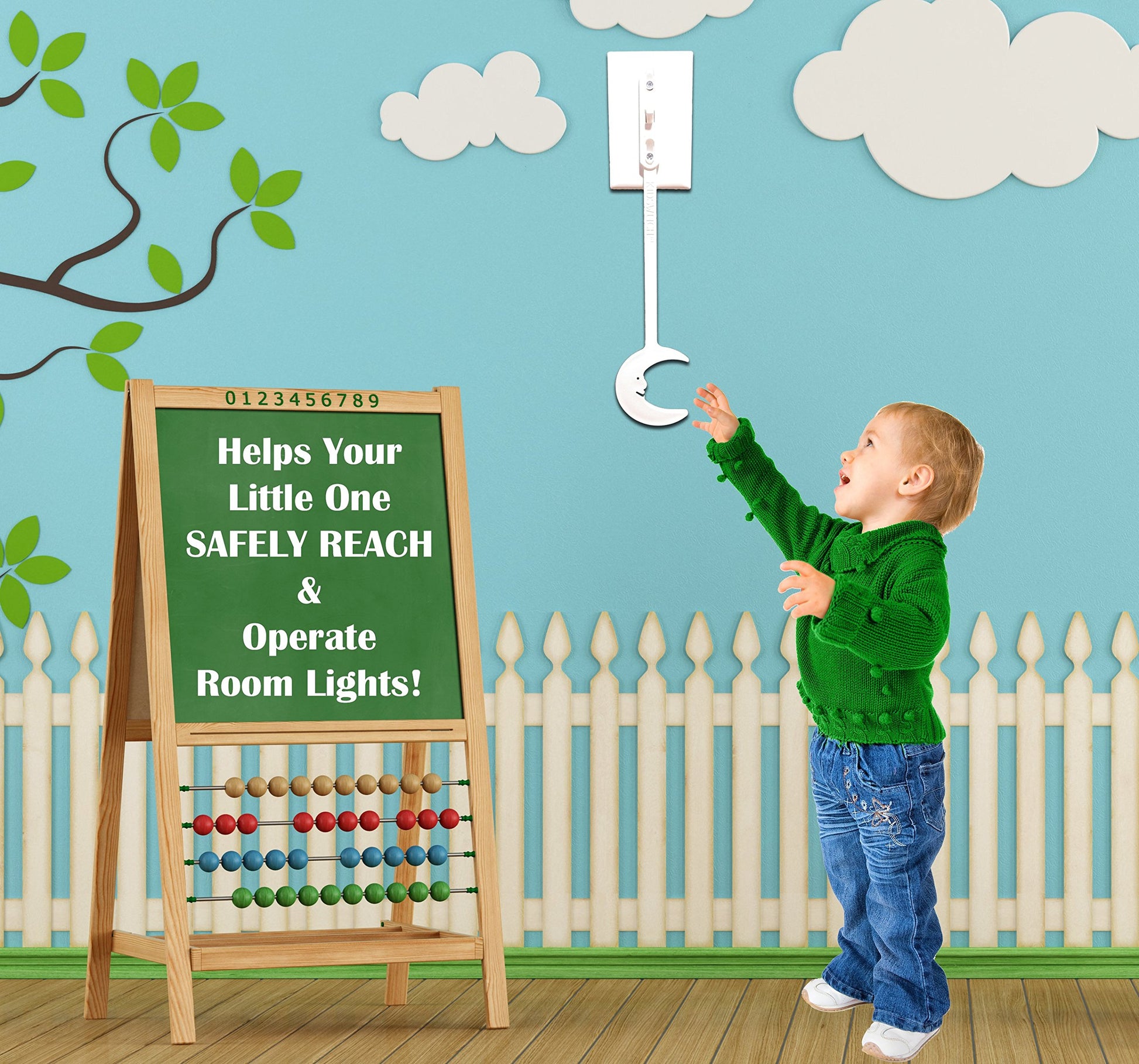 - Q: How does the KidSwitch help toddlers operate lights safely? A: The KidSwitch Light Switch Extender raises the light switch to a height accessible for toddlers, allowing them to safely reach and operate the switch without the need for makeshift solutions.