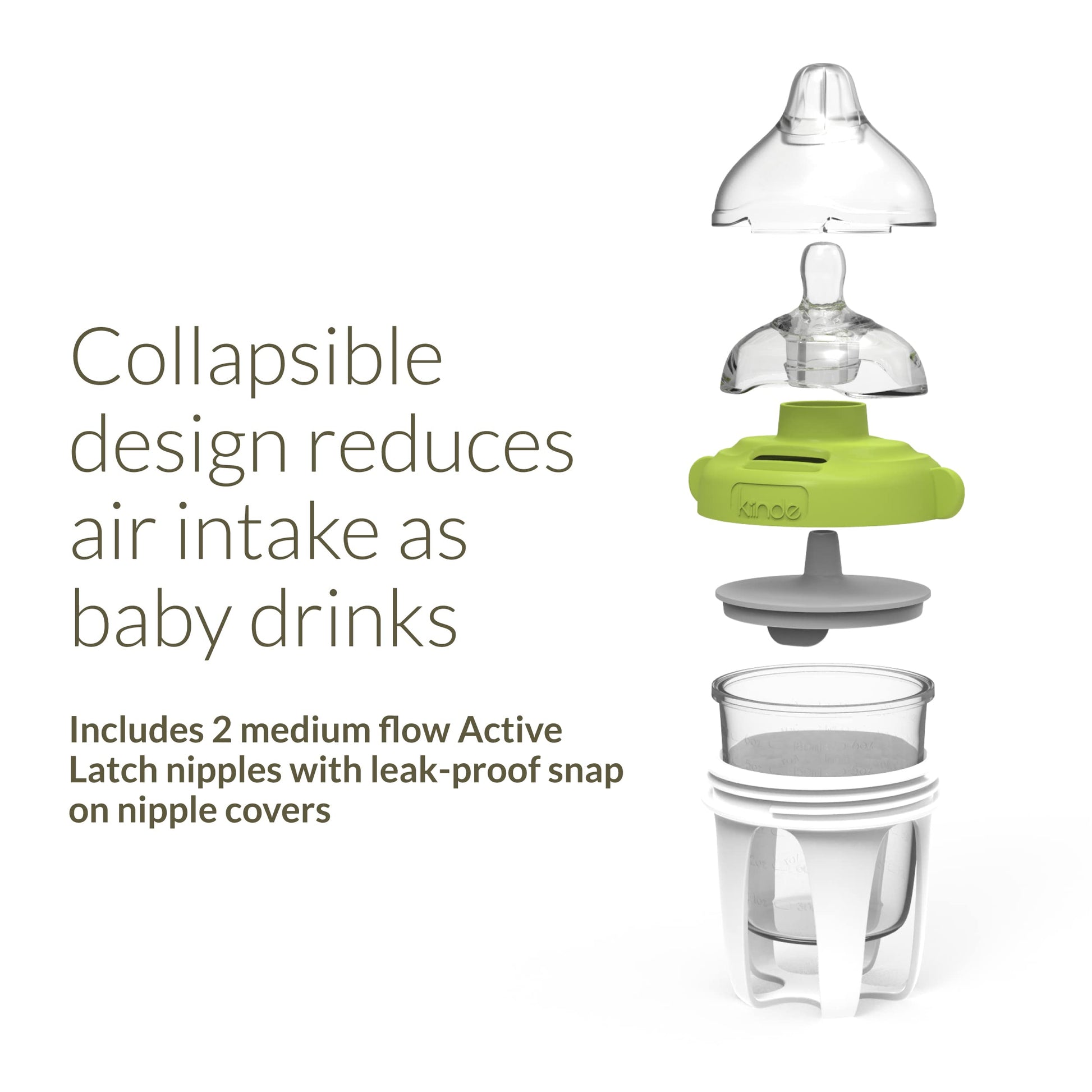 - Q: How many nipples are included with the bottle? A: The Kiinde Active Latch Silicone Baby Bottle includes two medium-flow Active Latch nipples, each with leak-proof snap-on covers.