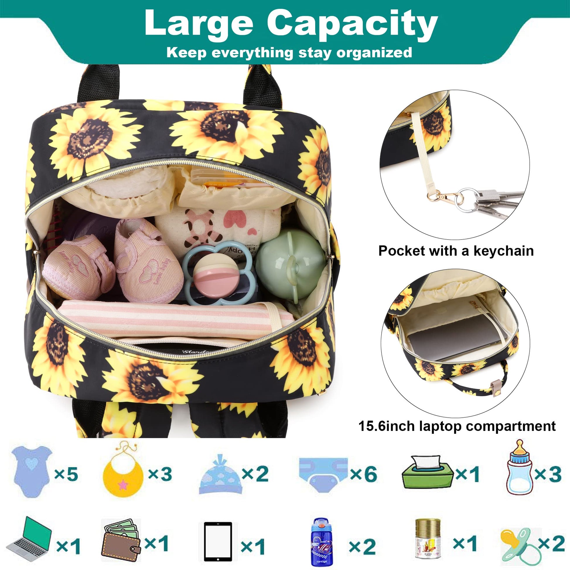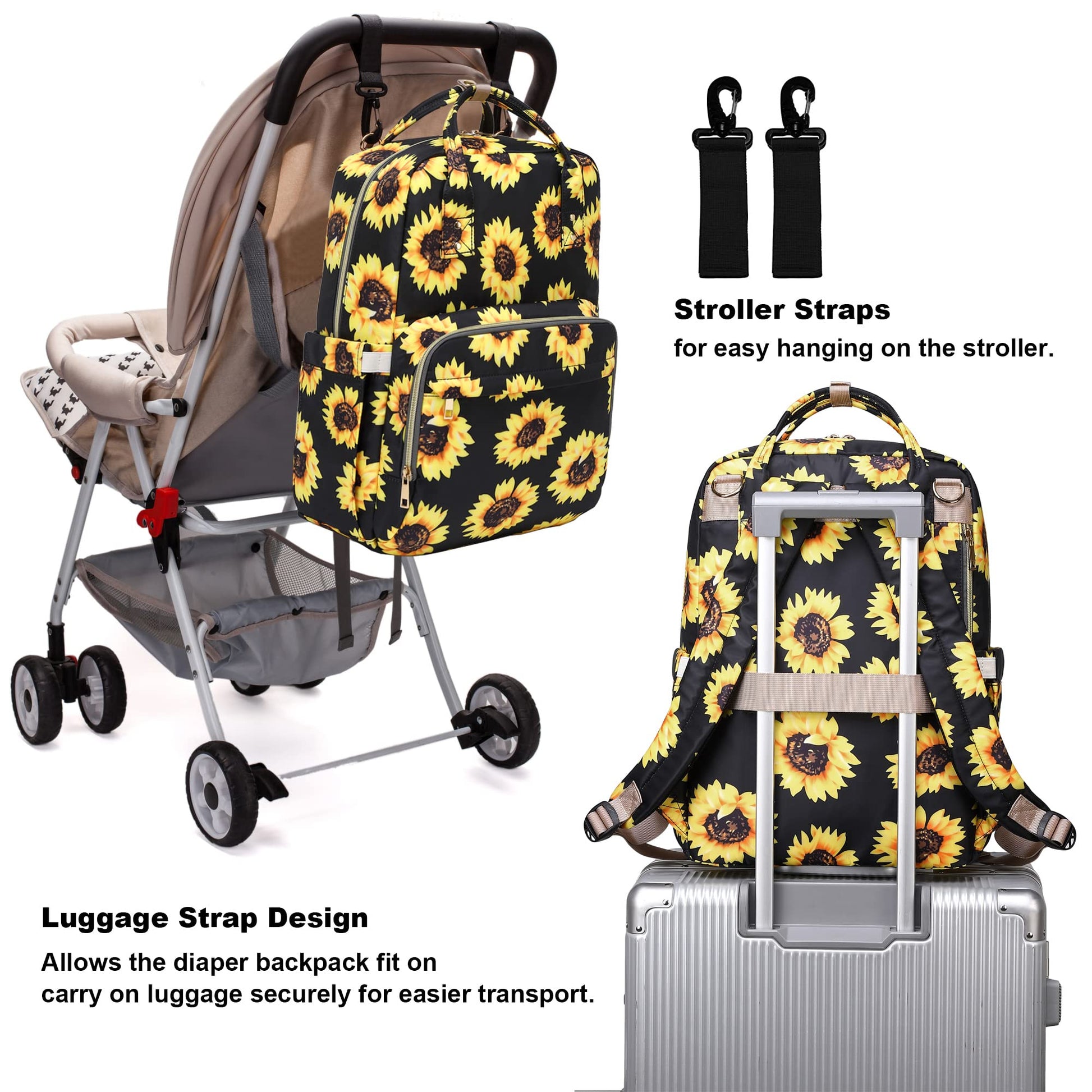 - Q: How do I clean the diaper bag? A: The Kouxunt Sunflower Diaper Bag Backpack is easy to clean; you can wipe it with a damp cloth or wash it by hand.