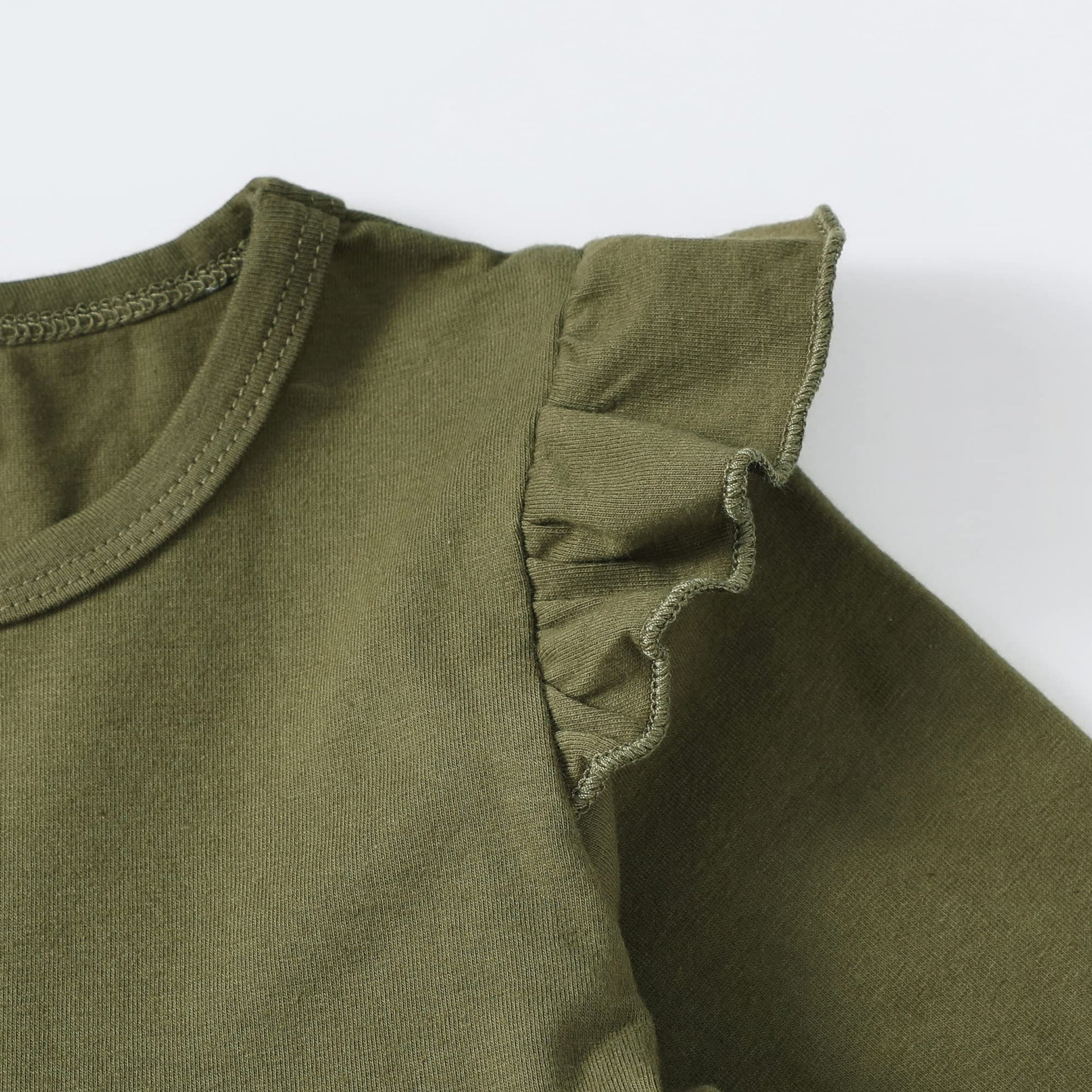 - Q: What is the design of the shirt in this set? A: The shirt features long sleeves with cute ruffle shoulders, a hi-lo irregular hem design, and adjustable elements for a comfortable fit.